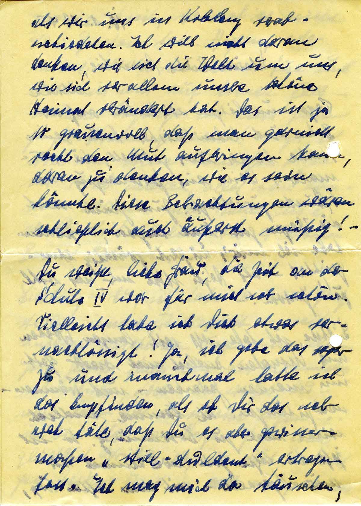 als wir uns in Koblenz verabschiedeten. Ich will nicht daran denken, wie ich die Welt um uns, wie sich vor allem unsere schöne Heimat verändert hat. Das ist ja so grauenvoll, daß man garnicht recht den Mut aufbringen kann, daran zu denken, wie es sein könnte. Diese Betrachtungen wären schließlich auch äußerst müßig! -