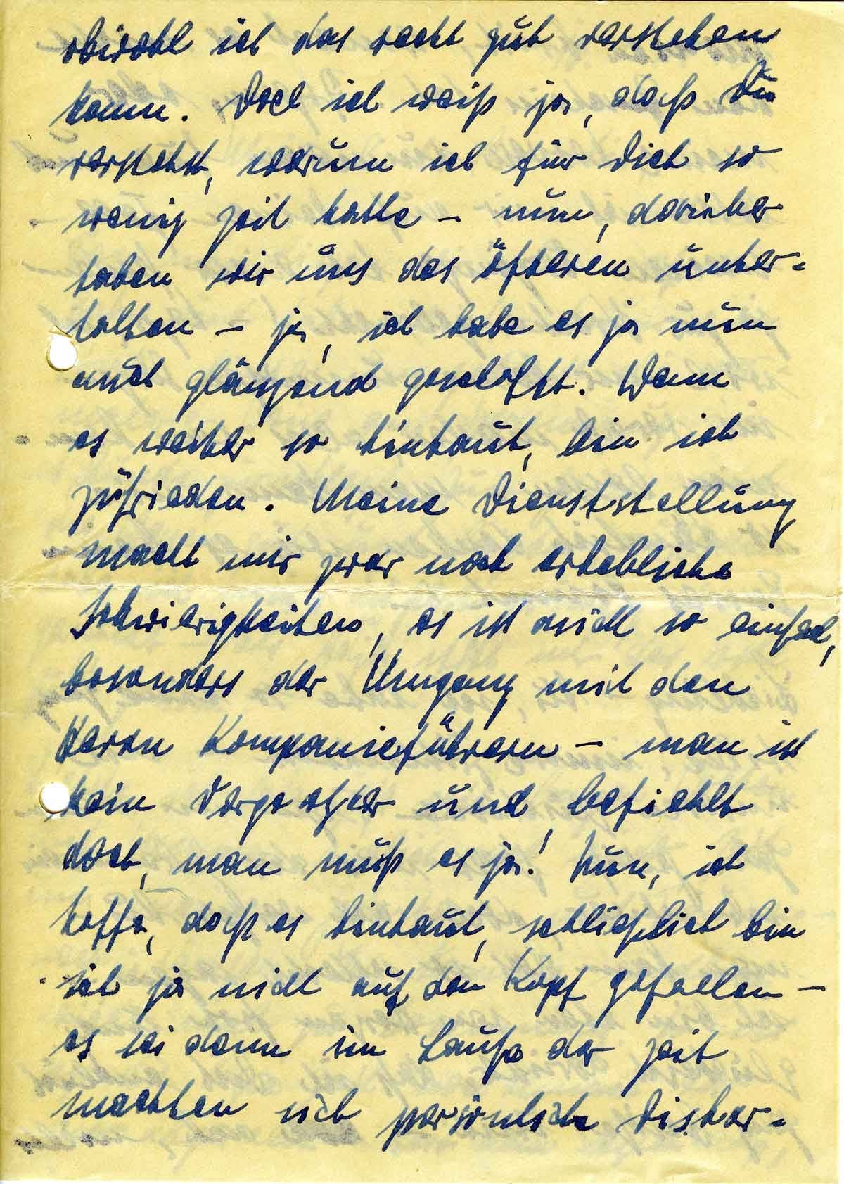 obwohl ich das recht gut verstehen kann. Doch ich weiß ja, daß Du verstehst, warum ich für Dich so wenig Zeit hatte - nun, darüber haben wir uns des öfteren unterhalten - ja, ich habe es ja nun auch glänzend geschafft. Wenn es weiter so hinhaut, bin ich zufrieden. Meine Dienststellung macht mir zwar noch erhebliche Schwierigkeiten, es ist nicht so einfach, besonders der Umgang mit den Herrn Kompanieführern - man ist kein Vorgesetzter und befiehlt doch, man muß es ja! Nun, ich hoffe, daß es hinhaut, schließlich bin ich ja nicht auf den Kopf gefallen - es sei denn im Laufe der Zeit machten sich persönliche Dishar-