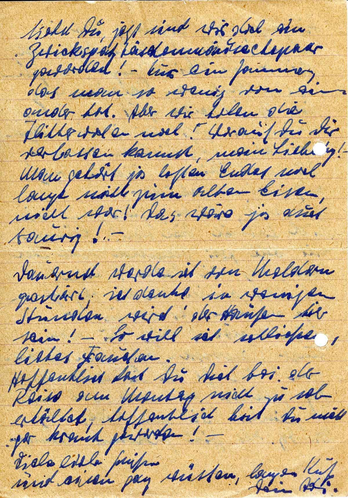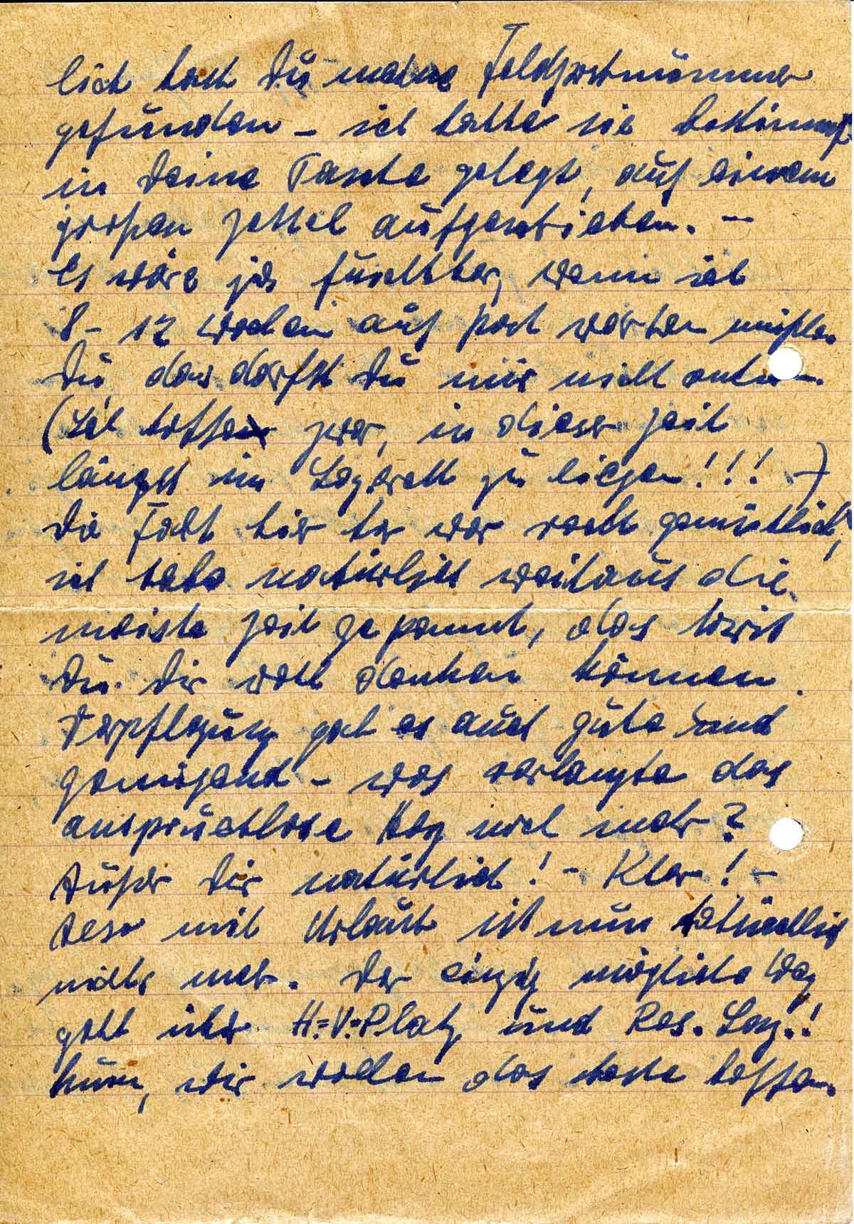 lich hast Du meine Feldpostnummer gefunden - ich hatte sie bestimmt in Deine Tasche gelegt, auf einem großen Zettel aufgeschrieben. - Es wäre ja furchtbar, wenn ich 8 - 12 Wochen auf Post warten müßte. Du, das darfst Du mir nicht antun. (Ich hoffe zwar, in dieser Zeit längst im Lazarett zu liegen!!! -) Die Fahrt hier her war recht gemütlich, ich habe natürlich weitaus die meiste Zeit gepennt, das wirst Du Dir wohl denken können. Verpflegung gab es auch gute und genügend - was verlangte das anspruchslose Herz noch mehr? Außer Dir natürlich! - Klar! - Also mit Urlaub ist nun tatsächlich nichts mehr. Der einzig mögliche Weg geht über H.-V.-Platz und Res.Laz.! Nun, wir wollen das beste hoffen.