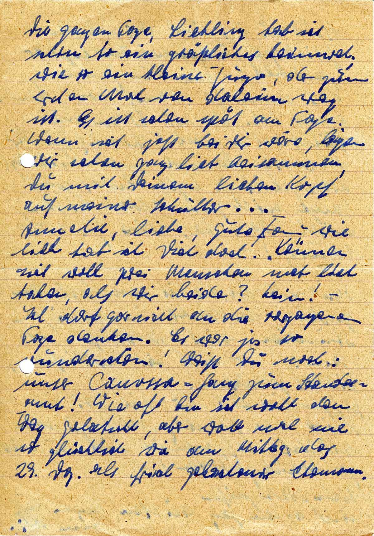 Die ganzen Tage, Liebling hab ich schon so ein gräßliches Heimweh; wie so ein kleiner Junge, der zum ersten Mal von daheim weg ist. Es ist schon spät am Tage. Wenn ich jetzt bei Dir wäre, lägen wir schon ganz lieb beisammen, Du mit Deinem lieben Kopf auf meiner Schulter ...