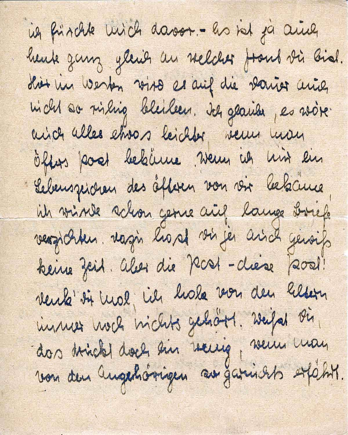 ich fürchte mich davor. - Es ist ja auch heute ganz gleich an welcher Front Du bist. Hier im Westen wird es auf die Dauer auch nicht so ruhig bleiben. Ich glaube, es wäre auch alles etwas leichter, wenn man öfters Post bekäme. Wenn ich nur ein Lebenszeichen des öfteren von Dir bekäme, ich würde schon gerne auf lange Briefe verzichten. Dazu hast Du ja auch gewiß keine Zeit. Aber die Post - diese Post! Denk’ Dir mal, ich habe von den Eltern immer noch nichts gehört. Weißt Du, das drückt doch ein wenig, wenn man von den Angehörigen so garnichts erfährt.