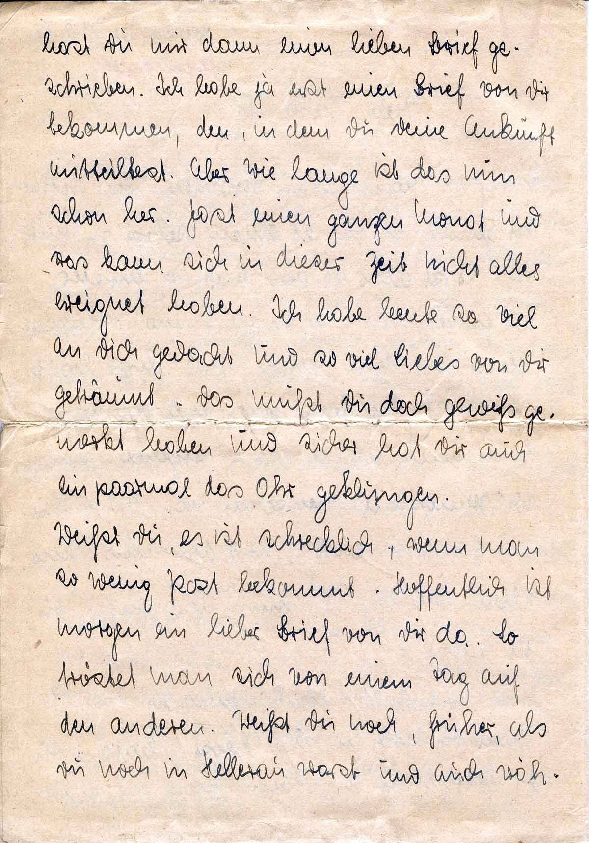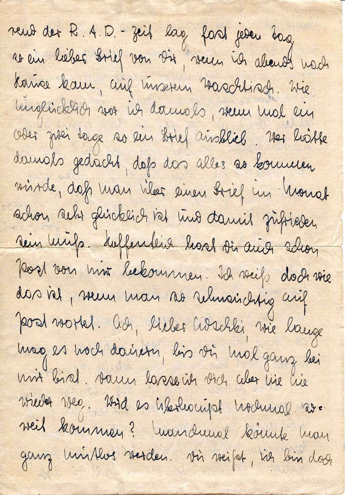 rend der R.A.D.-Zeit lag fast jeden Tag so ein lieber Brief von Dir, wenn ich abends nach Hause kam, auf unserem Waschtisch. Wie unglücklich war ich damals, wenn mal ein oder zwei Tage so ein Brief ausblieb. Wer hätte damals gedacht, daß das alles so kommen würde, daß man über einen Brief im Monat schon sehr glücklich ist und damit zufrieden sein muß. Hoffentlich hast Du auch schon Post von mir bekommen. Ich weiß doch wie das ist, wenn man so sehnsüchtig auf Post wartet. Ach, lieber Adschki, wie lange mag es noch dauern, bis Du mal ganz bei mir bist. Dann lasse ich Dich aber nie nie wieder weg. Wird es überhaupt nochmal soweit kommen? Manchmal könnte man ganz mutlos werden. Du weißt, ich bin doch