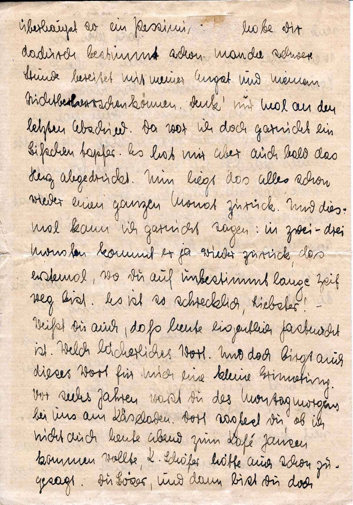 überhaupt so ein Pessimist. Ich habe Dir dadurch bestimmt schon manche schwere Stunde bereitet mit meiner Angst und meinem Nichtbeherrschenkönnen. Denk’ nur mal an den letzten Abschied. Da war ich doch garnicht ein Bißchen tapfer. Es hat mir aber auch bald das Herz abgedrückt. Nun liegt das alles schon wieder einen ganzen Monat zurück. Und diesmal kann ich garnicht sagen: in zwei - drei Monaten kommt er ja wieder zurück, das erstemal, wo Du auf unbestimmt lange Zeit weg bist. Es ist so schrecklich, Liebster! -