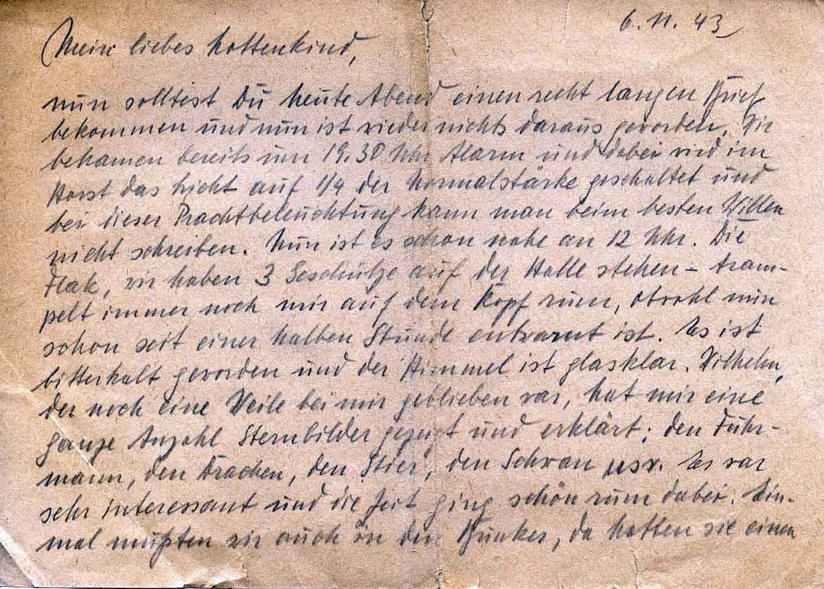 Nun solltest Du heute Abend einen recht langen Brief bekommen und nun ist wieder nichts draus geworden. Wir bekamen bereits um 19,30 Uhr Alarm und dabei wird im Horst das Licht auf 1/4 der Normalstärke geschaltet und bei dieser Prachtbeleuchtung kann man beim besten Willen nicht schreiben. Nun ist es schon nahe an 12 Uhr. Die Flak, wir haben 3 Geschütze auf der Halle stehen – trampelt immer noch mir auf dem Kopf rum, obwohl nun schon seit einer halben Stunde entwarnt ist. Es ist bitter kalt geworden und der Himmel ist glasklar. Wilhelm, der noch eine Weile bei mir geblieben war, hat mir eine ganze Anzahl Sternbilder gezeigt und erklärt: den Fuhrmann, den Drachen, den Stier, den Schwan usw. Es war sehr interessant und die Zeit ging schön rum dabei. Einmal mussten wir auch in den Bunker, da hatten wir einen