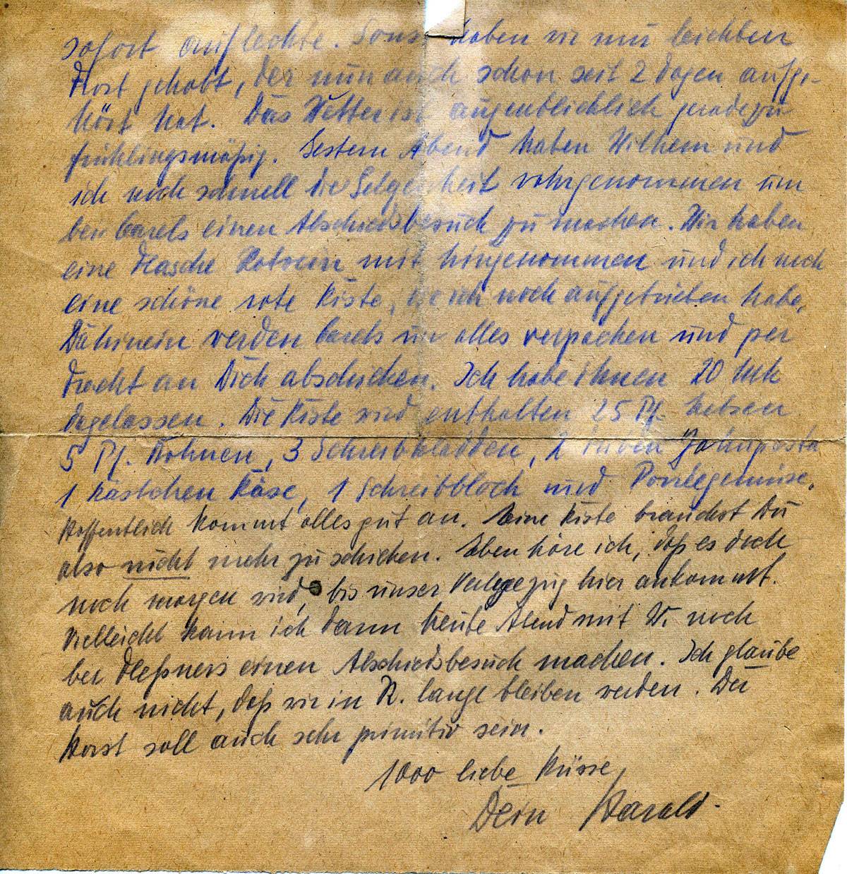 sofort aufleckte. Sonst haben wir nur leichten Frost gehabt, der nun auch schon seit 2 Tagen aufgehört hat. Das Wetter ist augenblicklich geradezu frühlingsmäßig. Gestern Abend haben Wilhelm und ich noch schnell die Gelegenheit wahrgenommen,um bei Carels einen Abschiedsbesuch zu machen. Wir haben eine Flasche Rotwein mitgenommen und ich noch eine schöne rote Kiste, die ich noch aufgetrieben habe. (…weise?) werden Carels mir alles verpacken und per Fracht an Dich abschicken. Ich habe ihnen 20 Mark dagelassen. Die Kiste wird enthalten 25 Pfund Erbsen, 5 Pfund Bohnen, 3 Schreibkladden, 1 (unleserlich), 1 Kästchen Käse, 1 Schreibblock und Porreegemüse. Hoffentlich kommt alles gut an. Eine Kiste brauchst Du also nicht zu schicken. Eben höre ich, daß es doch noch morgen wird, bis unser Verlegezug hier ankommt. Vielleicht kann ich dann heute Abend mit W. noch bei Heßners einen Abschiedsbesuch machen. Ich glaube auch nicht, daß wir in R. lange bleiben werden. Der Horst soll auch sehr primitiv sein.
