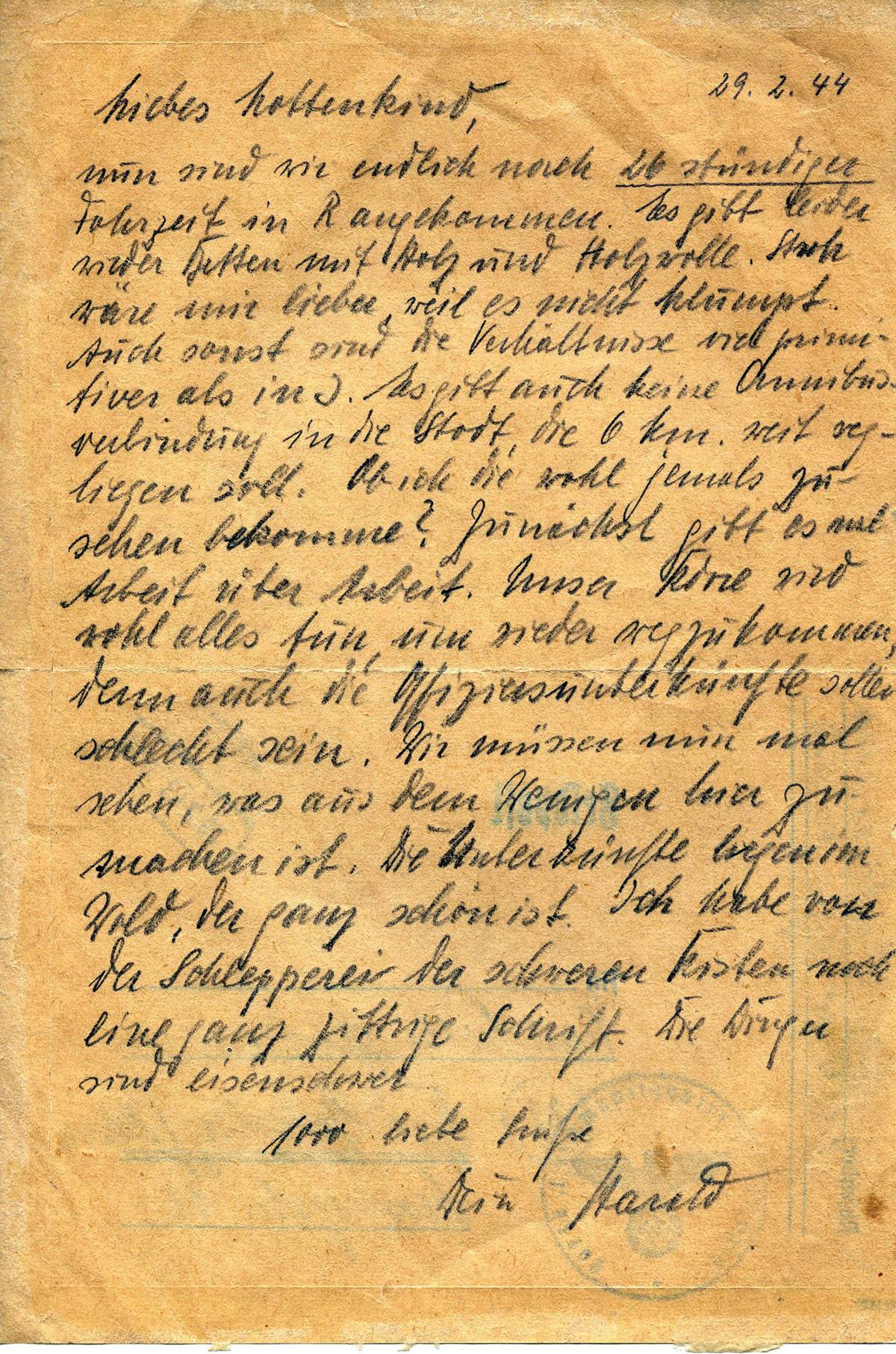 nun sind wir endlich nach 20stündiger Fahrzeit in R. Angekommen. Es gibt leider wieder Betten mit Holz und Holzwolle. Stroh wäre mir lieber, weil es nicht klumpt. Auch sonst sind die Verhältnisse noch primitiver als in J.(ever). Es gibt auch keine Omnibusverbindung in die Stadt, die 6 km weit weg liegen soll. Ob ich die wohl jemals zu sehen bekomme? Zunächst gibt es mal Arbeit über Arbeit. Unser (unleserlich) wird wohl alles tun, um wieder wegzukommen, denn auch die Unteroffiziersunterkünfte sollen schlecht sein.Wir müssen nun mal sehen, was aus dem Wenigen hier zu machen ist. Die Unterkünfte liege im Wald, der ganz schön ist. Ich habe von der Schlepperei der schweren Kisten noch eine ganz zittrige Schrift. Die Dinger sind eisenschwer.