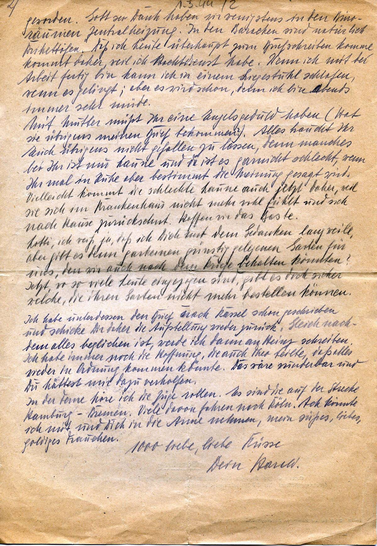 geworden. Gott sei Dank haben wir wenigstens in den Büroräumen Zentralheizung. In den Baracken sind natürlich Brikettöfen. Daß ich heute überhaupt zum Briefschreiben komme, kommt, weil ich Nachtdienst habe. Wenn ich mit der Arbeit fertig bin, kann ich in einem Liegestuhl schlafen, wenn es gelingt, aber es wird schon, denn ich bin abends immer sehr müde.