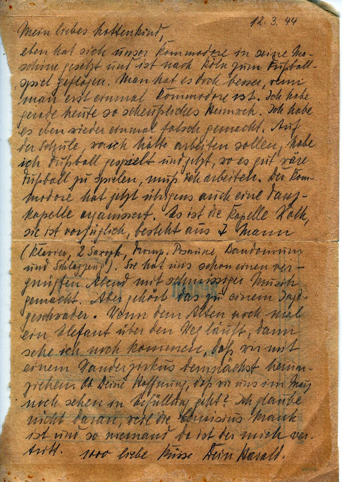 eben hat sich unser Kommodore in seine Maschine gesetzt und ist nach Köln zum Fußballspiel geflogen. Man hat es doch besser, wenn man erst einmal Kommodore ist. Ich habe gerade heute so scheußliches Heimweh. Ich habe es eben wieder einmal falsch gemacht. Auf der Schule, wo ich hätte arbeiten sollen, habe ich Fußball gespielt und jetzt, wo es gut wäre, Fußball zu spielen, muß ich arbeiten. Der Kommodore hat jetzt übrigens auch noch eine Tanzkapelle organisiert. Es ist die Kapelle Wölk, sie ist vergnüglich, besteht aus 7 Mann (Klavier, 2 Saxoph., Tromp. Posaune, Bandonium und Schlagzeug). Sie hat uns schon einen vergnügten Abend mit schmissiger Musik gemacht. Aber gehört das zu einem Jagdgeschwader. Wenn dem Alten noch mal ein Elefant über den Weg läuft, dann sehe ich noch kommen, daß wir mit einem Wanderzirkus demnächst rumziehen. Ob Deine Hoffnung, daß wir uns im März sehen, in Erfüllung geht? Ich glaube nicht daran, weil die Canisius krank ist und so niemand da ist, der mich vertritt.