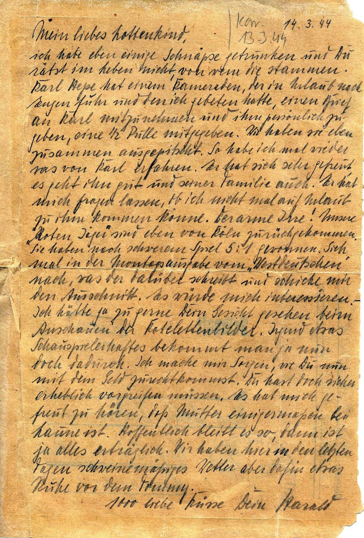 ich habe eben einige Schnäpse getrunken,und Du rätst im Augenblick nicht, von wem sie stammen. Karl Hepe hat einen Kameraden, der in Urlaub nach Engen(?) fuhr und den ich gebeten hatte, einen Brief an Karl mitzunehmen und ihm persönlich zu geben, eine ½ Pulle mitgegeben. Wir haben sie eben zusammen ausgepitscht. So habe ich mal wieder etwas von Karl erfahren. Er hat sich sehr gefreut, es geht ihm gut und seiner Familie auch. Er hat mich fragen lassen, ob ich nicht mal auf Urlaub zu ihm kommen könne. Der arme Irre! Unsere „Roten Jäger“ sind eben von Köln zurückgekommen. Sie haben nach schwerem Spiel 5:1 gewonnen. Sieh mal in der Montagsausgabe vom „Westdeutschen“ nach, was der darüber schreibt und schicke mir dem Ausschnitt. Es würde mich interessieren.