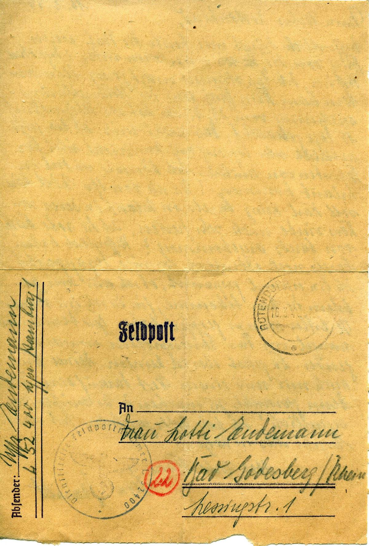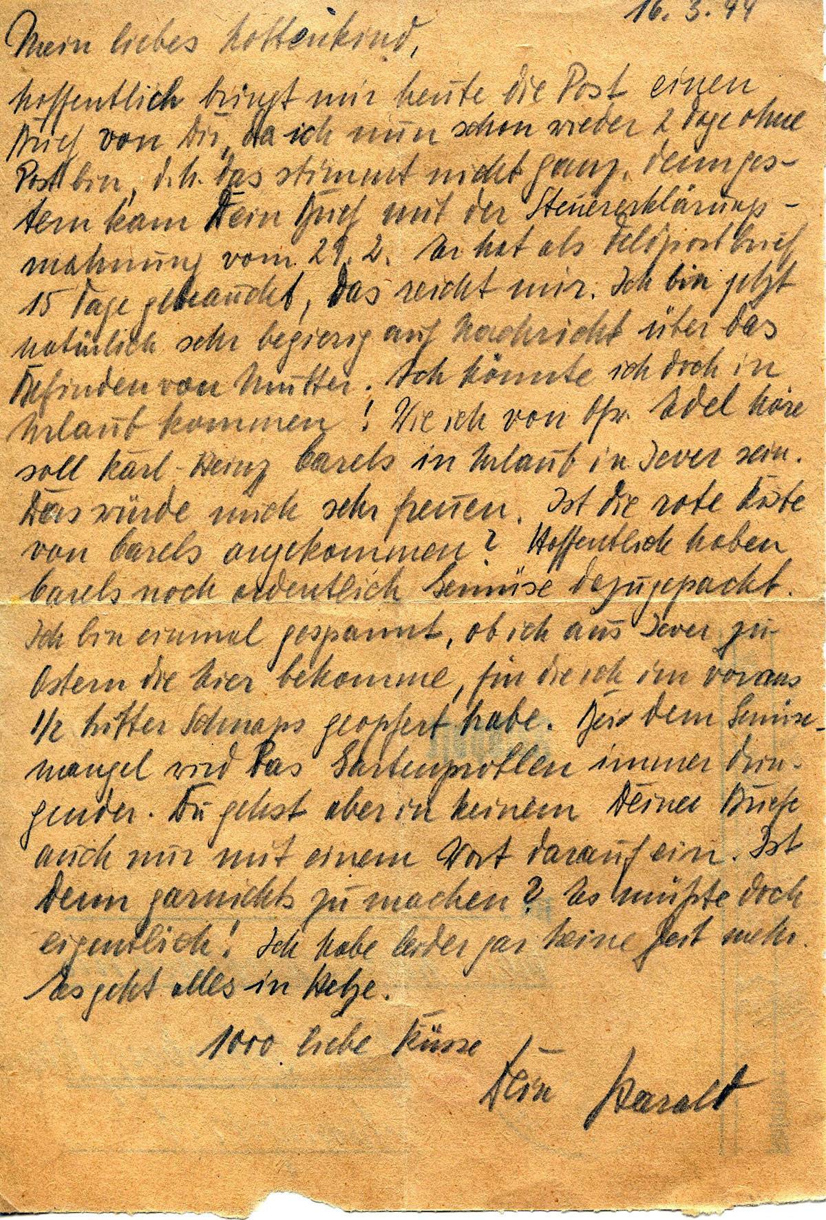 hoffentlich bringt mir heute die Post einen Brief von Dir, da ich nun schon wieder 2 Tage ohne Post bin, d.h., das stimmt nicht ganz, denn gestern kam Dein Brief mit der Steuererklärungs-mahnung vom 29.2. Er hat als Feldpostbrief 15 Tage gebraucht, das reicht mir. Ich bin jetzt natürlich sehr begierig auf Nachricht über das Befinden von Mutter. Ach könnte ich doch in Urlaub kommen! Wie ich von Ofw. (?) Edel höre, soll Karl-Heinz Carels in Urlaub in Jever sein. Das würde mich sehr freuen. Ist die rote Kiste von Carels angekommen? Hoffentlich haben Carels noch ordentlich Gemüse dazugepackt. Ich bin einmal gespannt, ob ich aus Jever zu Ostern die Eier bekomme, für die ich im Voraus ½ Liter Schnaps geopfert habe.