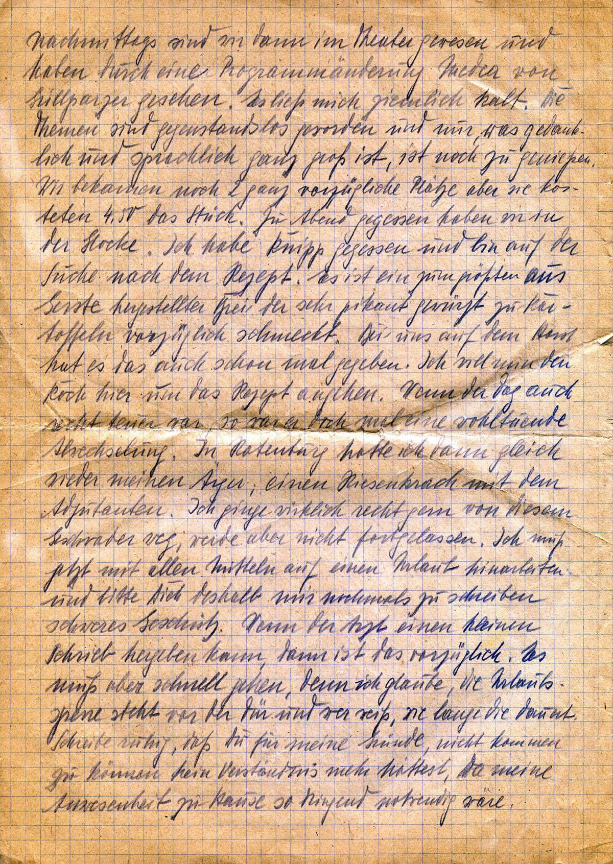 [...] nachmittags sind wir dann im Theater gewesen und haben durch eine Programmänderung Medea von Grillparzer gesehen. Es ließ mich ziemlich kalt. Die Themen sind gegenstandslos geworden, und nur, was gedanklich und sprachlich ganz groß ist, ist noch zu genießen. Wir bekamen noch 2 ganz vorzüglich Plätze, aber sie kosteten 4,50 das Stück. Zu Abend gegessen haben wir in der Glocke. Ich habe Knipp gegessen und bin auf der Suchen nach dem Rezept. Es ist ein zum größten Teil aus Gerste hergestellter Brei, der sehr pikant gewürzt zu Kartoffeln vorzüglich schmeckt. Bei uns auf dem Horst hat es da auch schon mal gegeben. Ich will nun den Koch hier um das Rezept angehen. Wenn der Tag auch recht teuer war, so war er doch eine wohltuende Abwechslung. In Rotenburg hatte ich dann gleich wieder meinen Ärger, einen Riesenkrach mit dem Adjutanten. Ich ginge wirklich recht gerne von diesem Geschwader weg, werde aber nicht fortgelassen. Ich muß jetzt mit allem Mitteln auf einen Urlaub hinarbeiten und bitte Dich deshalb, mir nochmals zu schreiben, schweres Geschütz. Wenn der Arzt einen kleinen Schrieb hergeben kann, dann ist es vorzüglich. Es muß aber schnell gehen, denn ich glaube, die Urlaubssperre steht vor der Tür, und wer weiß, wie lange die dauert. Schreibe ruhig, daß Du für meine Gründe, nicht kommen zu können, kein Verständnis mehr hättest, da meine Anwesenheit zu Hause so dringend notwendig wäre.