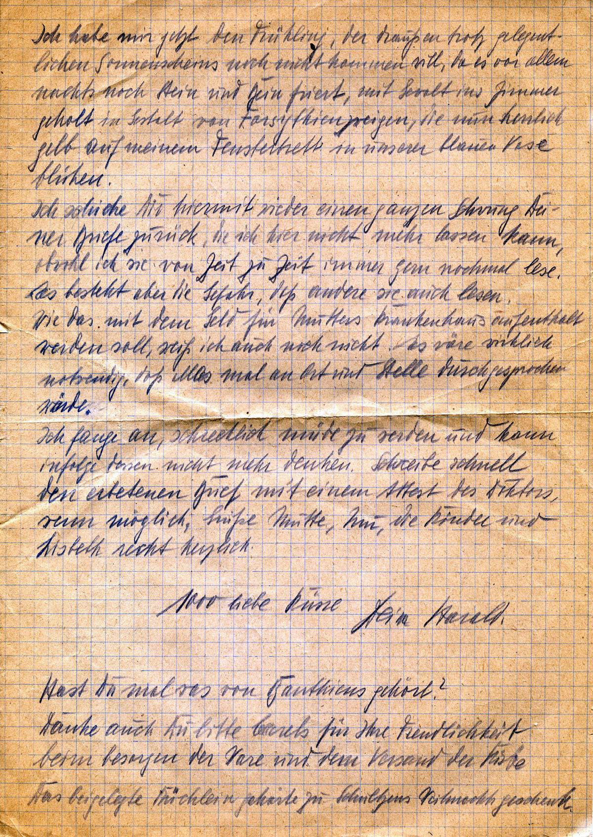 Ich fange an, schrecklich müde zu werden und kann infolgedessen nicht mehr denken. Schreibe schnell den erbetenen Brief mit einem Attest des Doktors, wenn möglich. Grüße Mutter, die Kinder und Lisbeth recht herzlich.