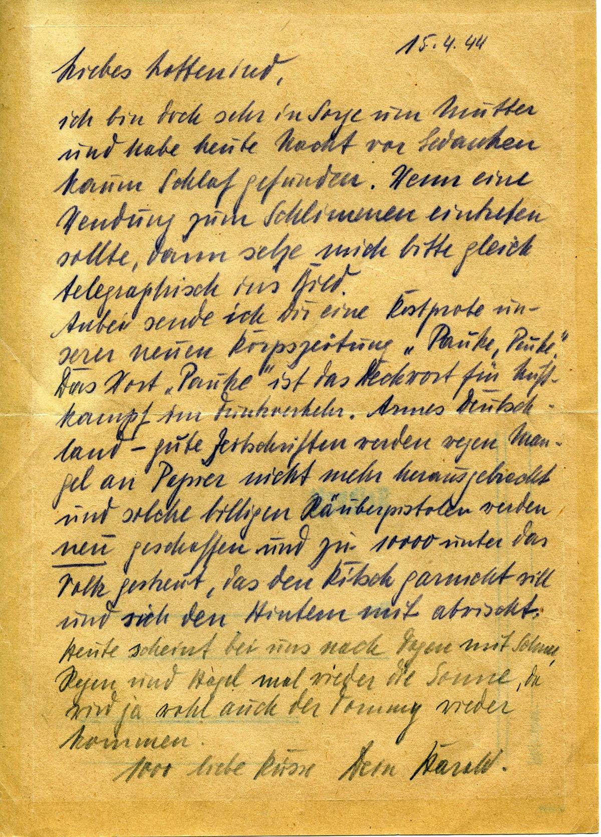 Anbei sende ich Dir einer Kostprobe unserer neuen Kriegszeitung „Pauke, Pauke (?)“. Das Wort „Pauke“ ist das Deckwort für Luftkampf im Funkverkehr. Armes Deutschland – gute Zeitschriften werden wegen Mangel an Papier nicht mehr herausgebracht und solche billigen Räuberpistolen werden neu geschaffen und zu 10000 unter das Volk gestreut, das den Kitsch garnicht will und sich den Hintern mit abwischt. Heute scheint bei uns nach Tagen mit Schnee, Regen und Hagel mal wieder die Sonne, da wird ja wohl auch der Tommy wieder kommen.