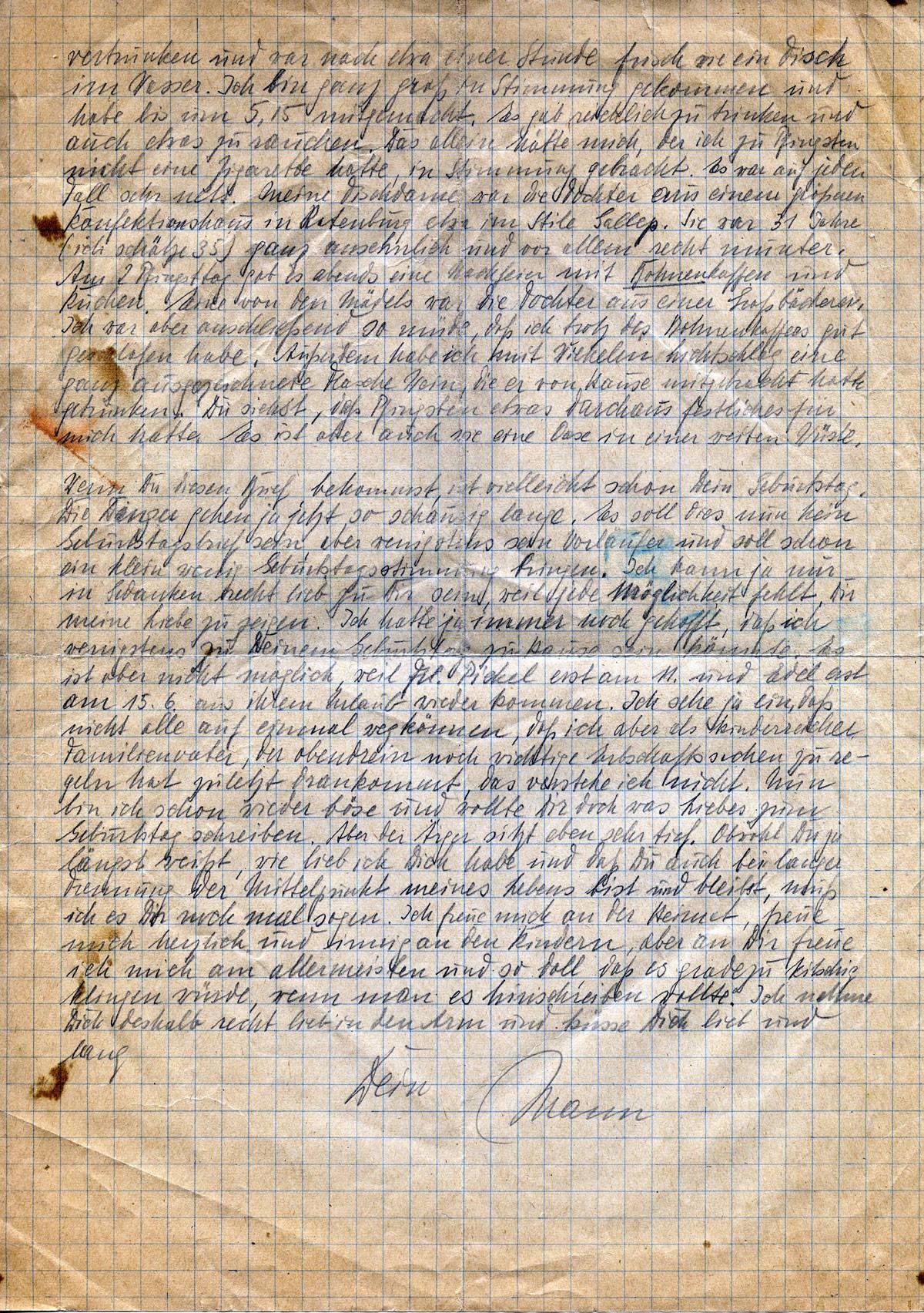 Wenn Du diesen Brief bekommst, ist vielleicht schon Dein Geburtstag. Die Dinger(?) gehen ja jetzt so schaurig lange. Es soll dies nun kein Geburtstagsbrief sein, aber wenigstens sein Vorläufer und soll schon ein klein wenig Geburtstagsstimmung bringen. Ich kann ja nur in Gedanken recht lieb zu Dir sein, weil jede Möglichkeit fehlt, Dir meine Liebe zu zeigen. Ich hatte ja immer noch gehofft, daß ich wenigstens zu Deinem Geburtstag zu Hause sein könnte.Es ist aber nicht möglich, weil Frl. Pickel erst am 11. und Edel erst am 15.6. aus ihrem Urlaub wieder kommen. Ich sehe ja ein, daß nicht alle auf einmal wegkönnen. Daß ich aber als kinderreicher Familienvater, der obendrein noch wichtige Erbschaftssachen zu regeln hat zuletzt drankommt, das verstehe ich nicht. Nun bin ich schon wieder böse und sollte Dir doch etwas Liebes zum Geburtstag schreiben. Aber der Ärger sitzt eben doch sehr tief. Obwohl Du ja längst weißt,wie lieb ich Dich habe und daß Du auch bei langer Trennung der Mittelpunkt meines Lebens bist und bleibst, muß ich es Dir noch mal sagen. Ich freue mich an der Heimat, freue mich herzlich und innig an den Kindern, aber an Dir freue ich mich am allermeisten und so toll, daß es geradezu kitschig klingen würde, wenn man es hinschreiben sollte. Ich nehme Dich dehalb ganz lieb in den Arm und küsse Dich lieb und lang.