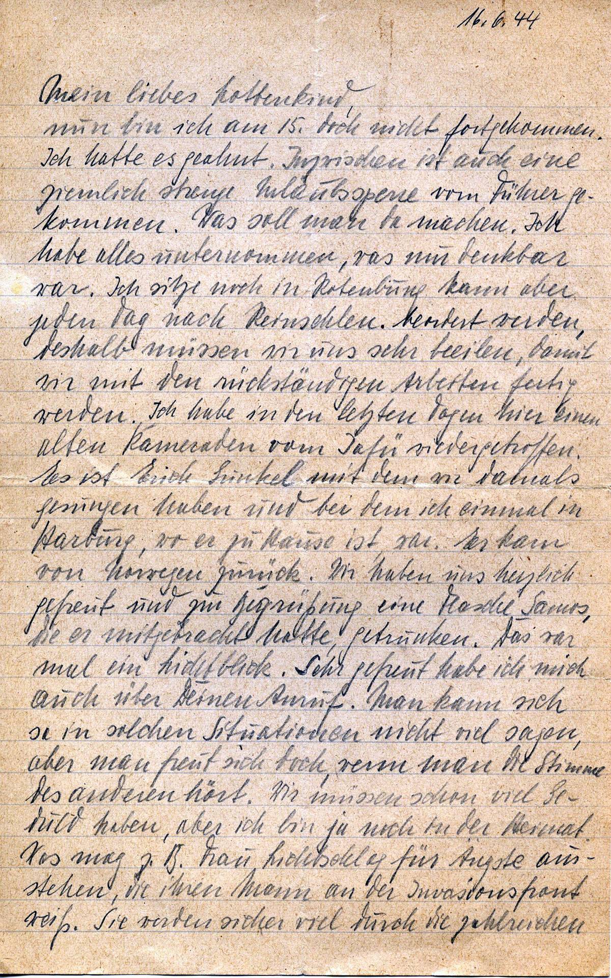 nun bin ich am 15. doch nicht fortgekommen. Ich hatte es geahnt. Inzwischen ist auch eine ziemlich strenge Urlaubssperre vom Führer gekommen. Was soll man da machen. Ich habe alles unternommen, was nur denkbar war. Ich sitze noch in Rotenburg, kann aber jeden Tag nach R(h)einsehlen beordert werden, deshalb müssen wir uns sehr beeilen, damit wir mit den rückständigen Arbeiten fertig werden. Ich habe in den letzten Tagen hier einen alten Kameraden vom Jafü (?) wiedergetroffen. Es ist Erich Kinkel (?) mit dem wir damals gesungen haben und bei dem ich mal in Harburg, wo er zu Hause ist, war. Er kam von Norwegen zurück. Wir haben uns herzlich gefreut und zur Begrüßung eine Flasche Samos, die er mitgebracht hatte, getrunken. Das war mal ein Lichtblick. Sehr gefreut habe ich mich auch über Deinen Anruf. Man kann sich so in solchen Situationen nicht viel sagen, aber man freut sich doch, wenn man die Stimme des anderen hört. Wir müssen schon viel Geduld haben, aber ich bin ja noch in der Heimat. Was mag z.B. Frau Lichtschlag für Ängste ausstehen, die ihren Mann an der Invasionsfront weiß. Sie werden sicher viel durch die zahlreichen