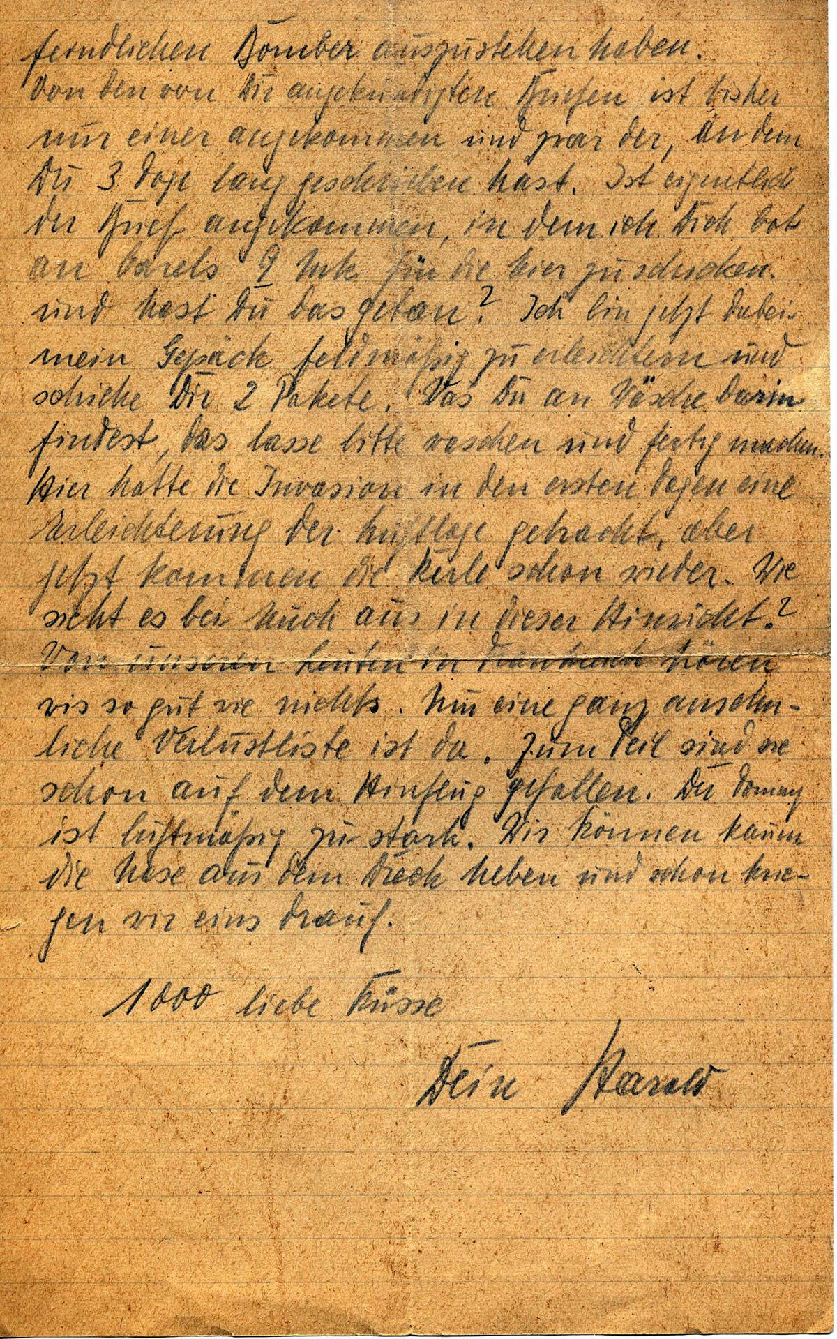 feindlichen Bomber auszustehen haben. Von den von Dir angekündigten Briefen ist bisher nur einer angekommen und zwar der, an dem Du drei Tage lang geschrieben hast. Ist eigentlich der Brief angekommen, in dem ich Dich bat an Carels 9 Mk. für die Eier zu schicken und hast Du das getan? Ich bin jetzt dabei, mein Gepäck feldmäßig zu erleichtern und schicke Dir 2 Pakete. Was Du an Wäsche darin findest, das lasse bitte waschen und fertig machen. Hier hatte die Invasion in den ersten Tagen eine Erleichterung der Luftlage gebracht, aber jetzt kommen die Kerle schon wieder. Wie sieht es bei Euch aus in dieser Hinsicht? Von unseren Leuten in Frankreich hören wir so gut wie nichts. Nur eine ganz ansehnliche Verlustliste ist da. Zum Teil sind sie schon auf dem Hinflug gefallen. Der Tommy ist luftmäßig zu stark. Wir können kaum die Nase aus dem Dreck heben und schon kriegen wir eins drauf.