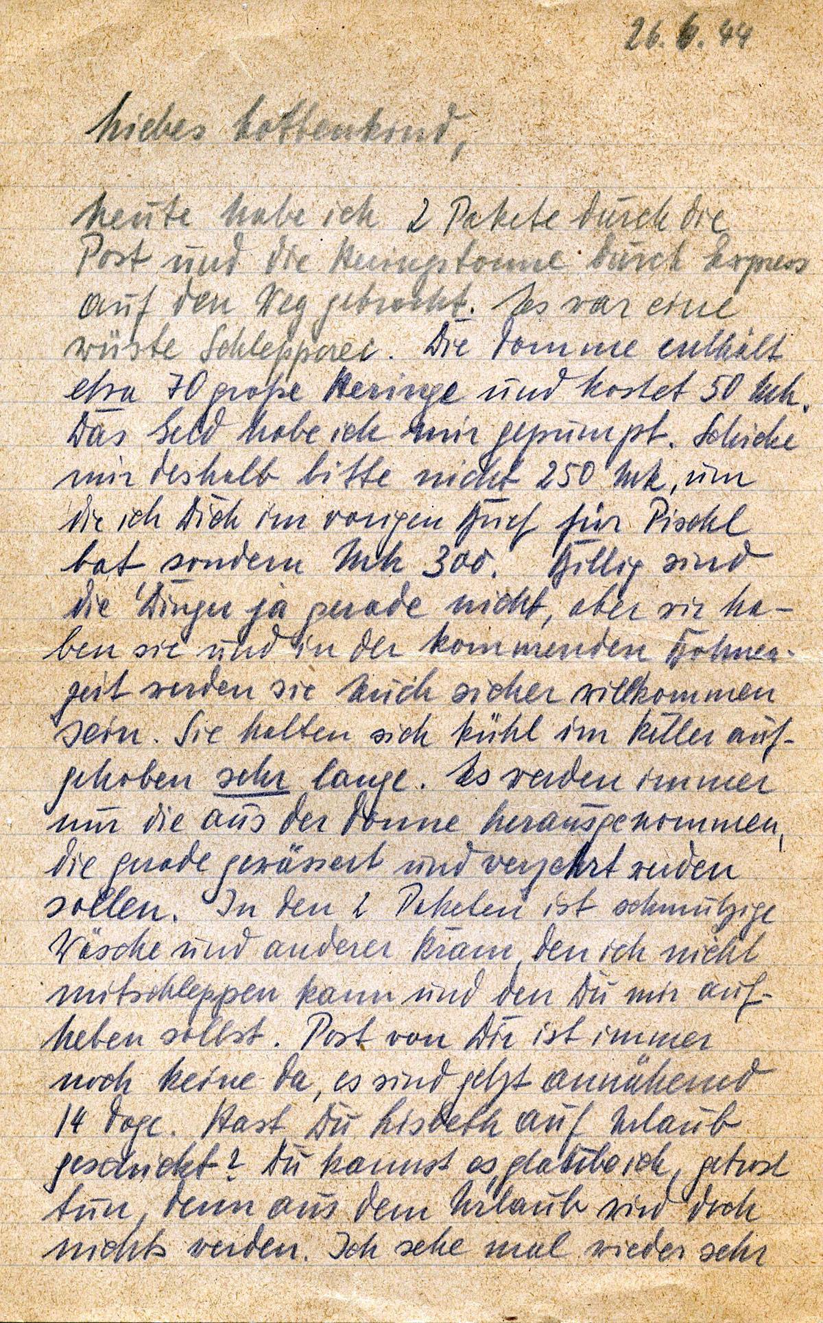 heute habe ich 2 Pakete durch die Post und die Heringstonne durch Express auf den Weg gebracht. Es war eine wüste Schlepperei. Die Tonne enthält etwa 70 große Heringe und kostet 50 Mk. Das Geld habe ich mir gepumpt. Schicke mir deshalb bitte nicht 250 Mk, um die ich Dich im vorigen Brief für Pischl bat, sondern Mk 300. Billig sind die Dinger ja gerade nicht, aber wir haben sie und in der kommenden Bohnenzeit werden sie Euch sicher willkommen sein. Sie halten sich kühl im Keller aufgehoben sehr lange. Es werden immer nur die aus der Tonne herausgenommen, die gerade gewässert und verzehrt werden sollen. In den 2 Paketen ist schmutzige Wäsche und anderer Kram, den ich nicht mitschleppen kann und den Du mir aufheben sollst. Post von Dir ist immer noch keine da, es sind jetzt annähernd 14 Tage. Hast Du Lisbeth auf Urlaub geschickt? Du kannst es, glaube ich, getrost tun, denn aus dem Urlaub wird doch nichts werden. Ich sehe mal wieder sehr