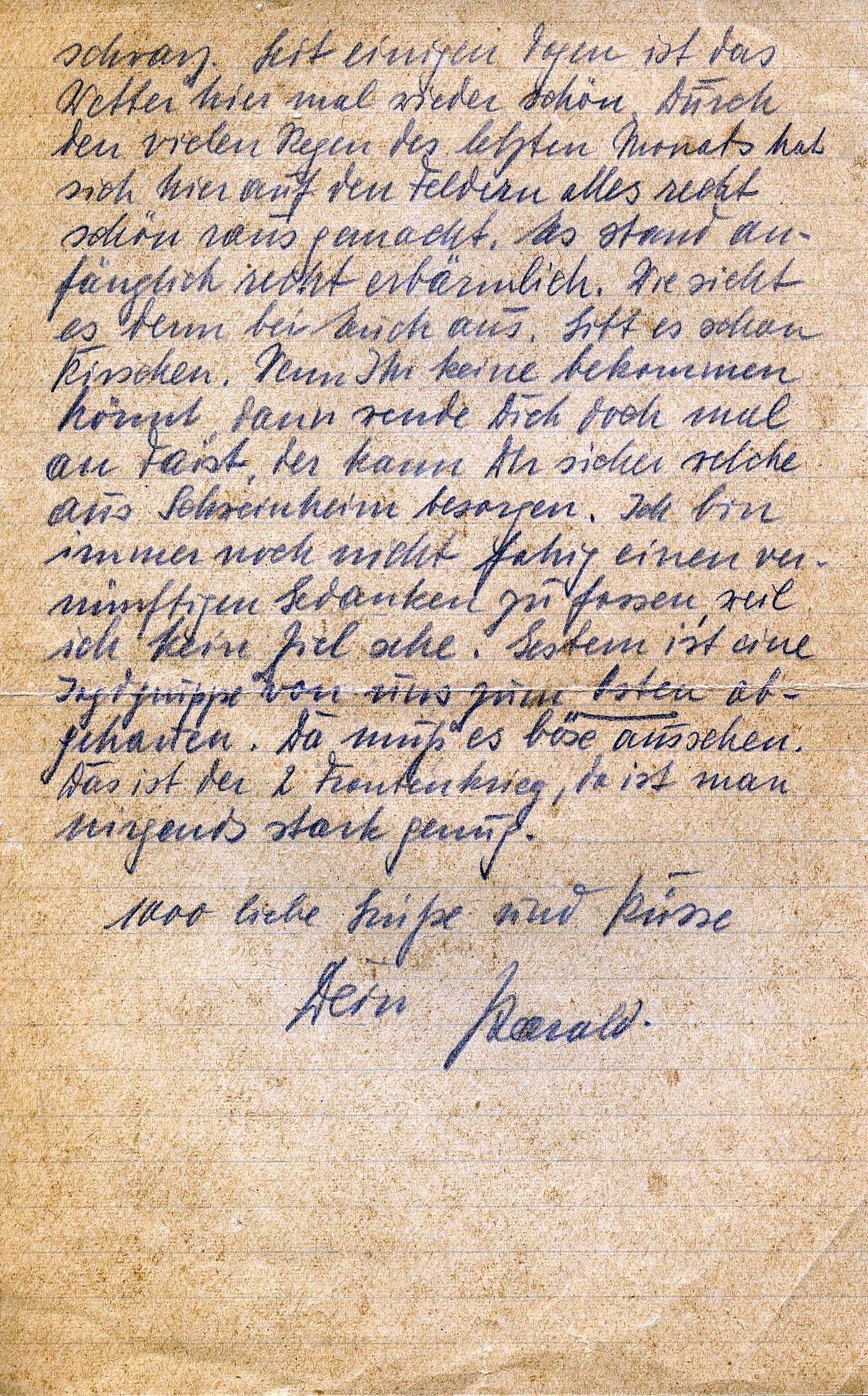schwarz. Seit einigen Tagen ist das Wetter hier mal wieder schön. Durch den vielen Regen des letzten Monats hat sich auf den Feldern alles recht schön rausgemacht. Es stand anfänglich recht erbärmlich. Wie sieht es denn bei Euch aus. Gibt es schon Kirschen. Wenn Ihr keine bekommen könnt, dann wende Dich doch einmal an Farst(?), der kann Dir sicher welche aus Schweinheim besorgen. Ich bin immer noch nicht fähig einen vernünftigen Gedanken zu fassen, weil ich kein Ziel sehe. Gestern ist eine Jagdgruppe von uns zum Osten abge..(unleserlich).Da muß es böse aussehen. Das ist der