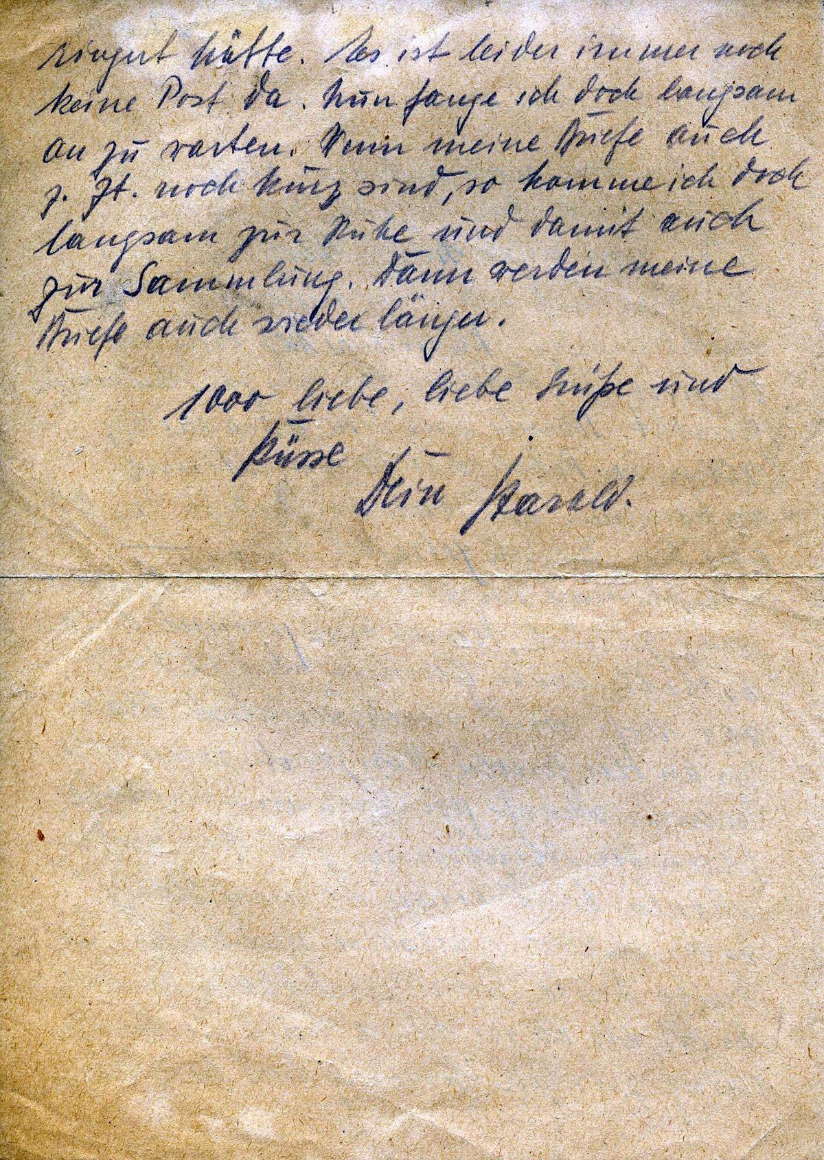 ich komme noch mal mit einer Bitte. Der Zustand ohne Uhr ist schauerlich. Da wir jetzt auch nachts Wache stehen müssen hat sich dieser Zustand weiter verschlimmert. Kümmere Dich bitte mal darum. Ich habe sie damals zu Schumann gebracht. Schreibe mir bitte auch gleich, wenn die Pakete und die Heringstonne ankommen und wann und ob Du das Geld auf den Marsch gebracht hast. ----------