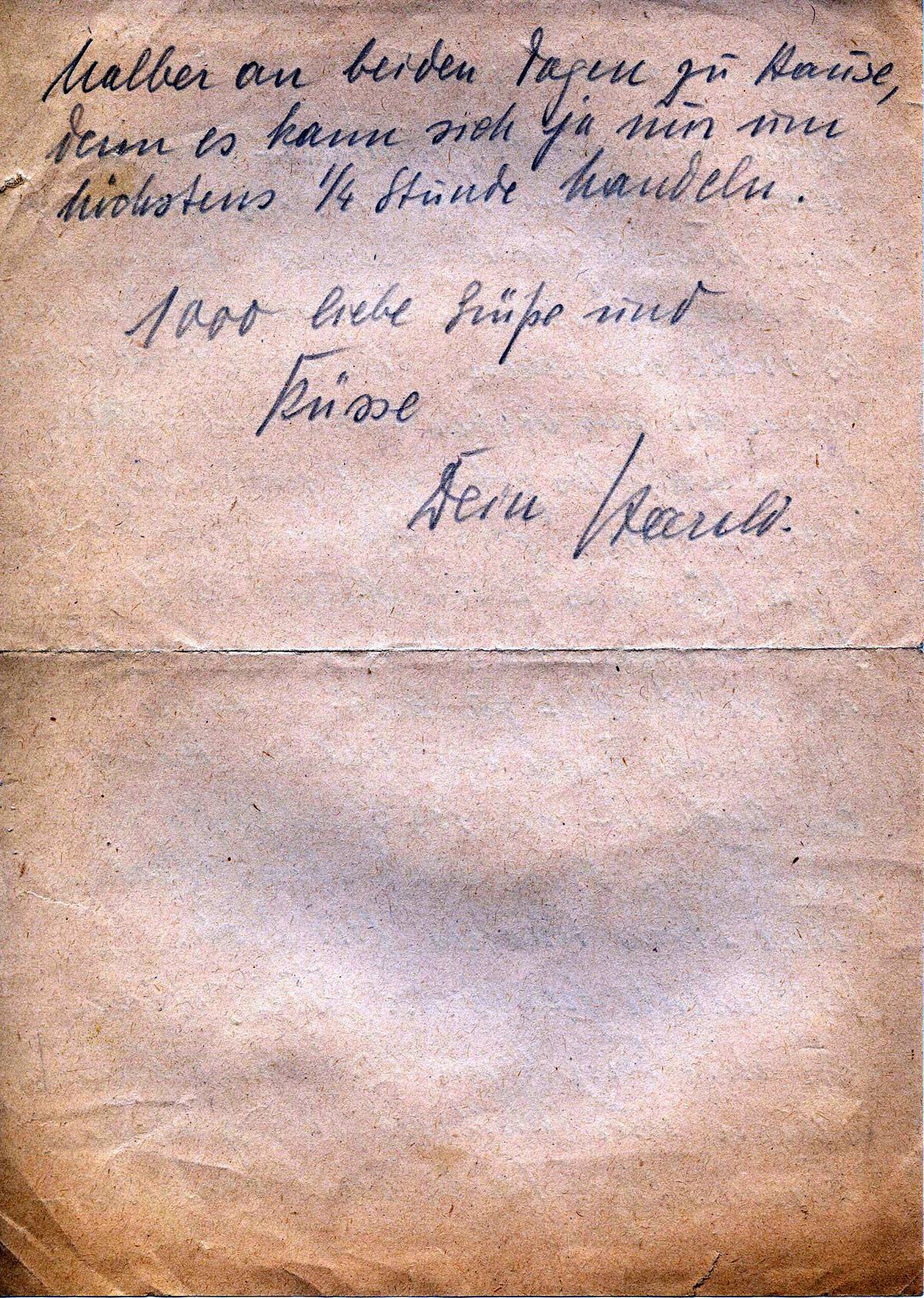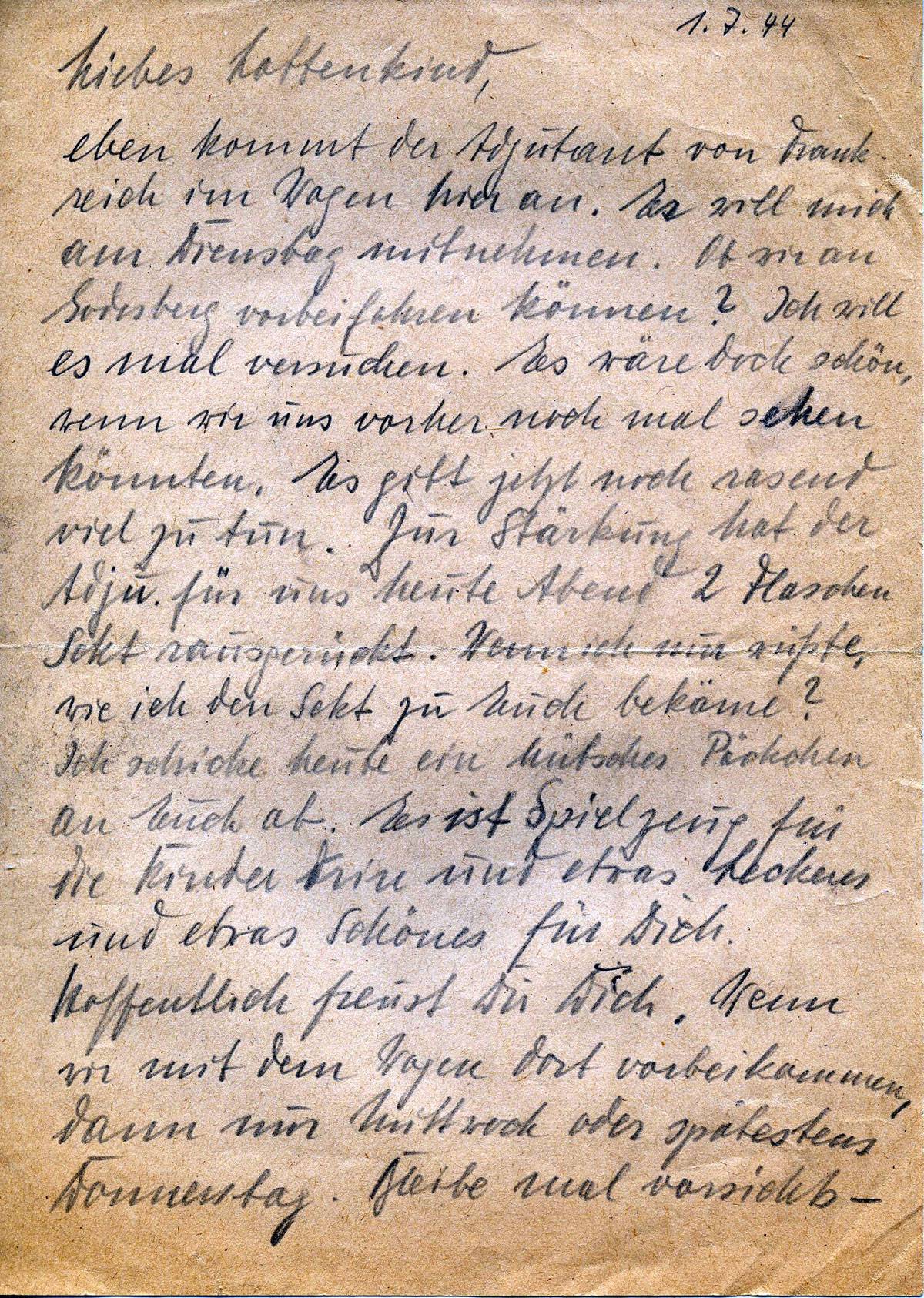 eben kommt der Adjutant von Frankreich im Wagen hier an. Er soll mich am Dienstag mitnehmen. Ob sie an Godesberg vorbeifahren können? Ich will es mal versuchen. Es wäre doch schön, wenn wir uns vorher nochmal sehen könnten. Es gibt jetzt noch rasend viel zu tun. Zur Stärkung hat der Adju. Für uns heute Abend 2 Flaschen Sekt rausgerückt. Wenn ich nur wüßte, wie ich den Sekt zu Euch bekäme? Ich schicke heute ein hübsches Päckchen an Euch ab. Es ist Spielzeug für die Kinder drin und etwas Leckeres und etwas Schönes für Dich. Hoffentlich freust Du Dich. Wenn wir mit dem Wagen dort vorbeikommen, dann nur Mittwoch oder spätestens Donnerstag. Bleibe mal vorsichts
