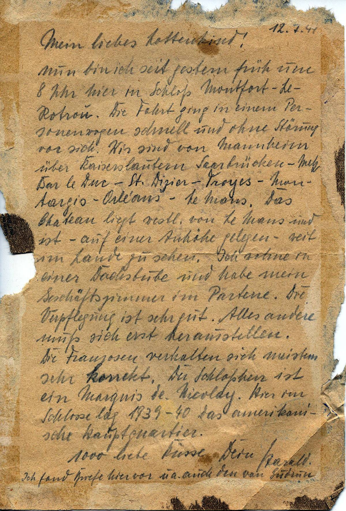 nun bin ich seit gestern früh um 8 Uhr hier in Schloß Montfort-le-Rotrou (im Pays de la Loire). Die Fahrt ging in einem Personenwagen schnell und ohne Störung vor sich. Wir sind von Mannheim über Kaiserslautern-Saarbrücken- Metz- Bar le Duc, St. Dizier (?) - Troyes – Montargis(?) - Orleans - Le Mans. Das Chateau liegt westl. von Le Mans und ist - auf einer Anhöhe gelegen – weit im Lande zu sehen. Ich wohne in einer Dachstube und habe mein Geschäftszimmer im Parterre. Die Verpflegung ist sehr gut. Alles andere muß sich erst herausstellen. Die Franzosen verhalten sich meistens sehr korrekt. Der Schloßherr ist ein Marquis de Nicolay. Hier im Schlosse lag 1939-40 das amerikanische Hauptquartier.