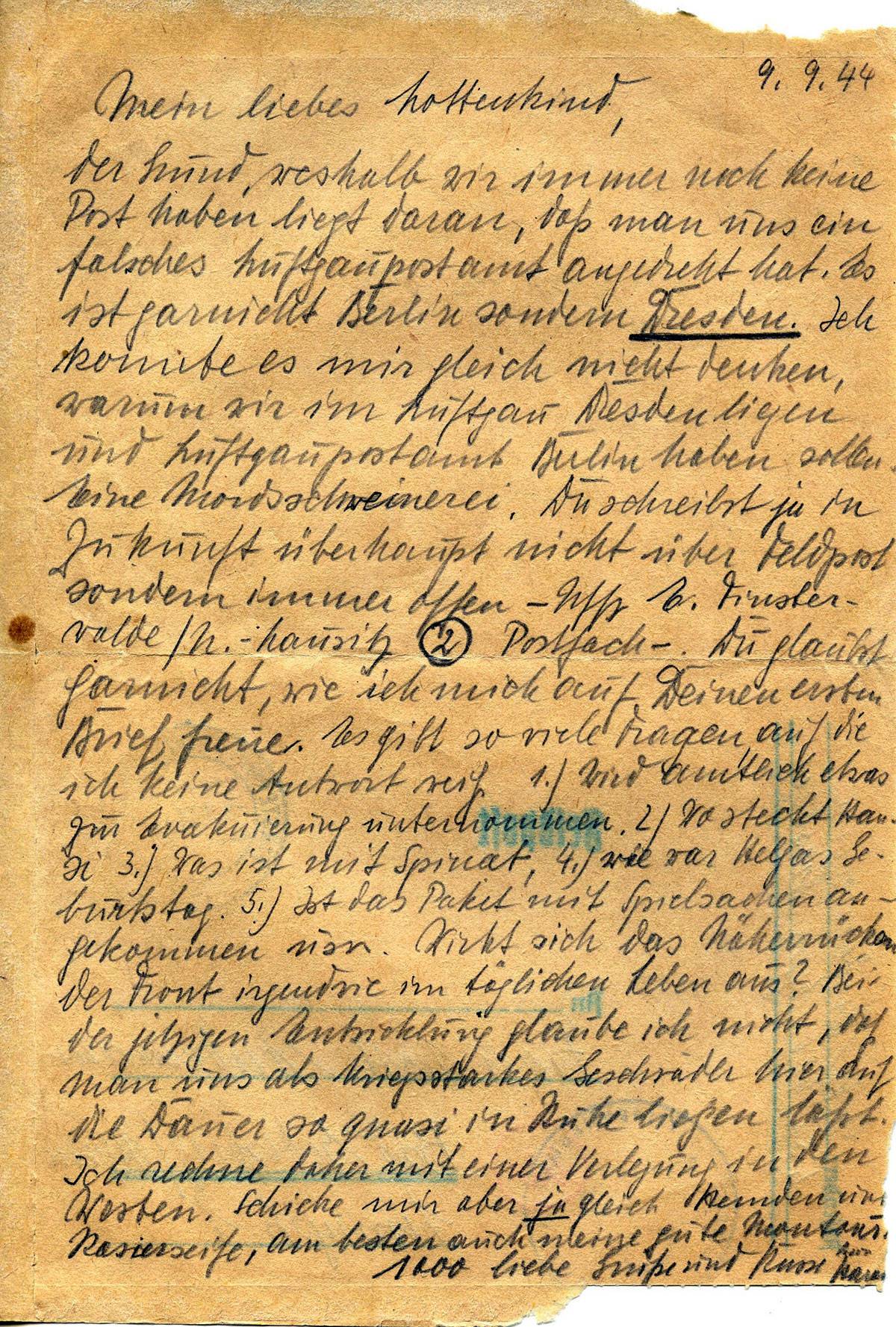 Der Grund, weshalb wir immer noch keine Post haben liegt daran, daß man uns ein falsches Luftgaupostamt angedreht hat. Es ist garnicht Dresden. Ich konnte es mir gleich nicht denlen warum wir im Luftgau Dresden liegen und Luftgaupostamt Berlin haben sollen. Eine Mordschweinerei. Du schreibst ja in Zukunft überhaupt nicht über Feldpost sondern immer offen – Uffz. E Finsterwalde/N.-Lausitz 2 Postfach- . Du glaubst garnicht, wie ich mich auf Deinen ersten Brief freue. Es gibt so viele Fragen, auf die ich keine Antwort weiß 1.) Wird amtlich etwas zur Evakuierung unternommen. 2.) Wo steckt Hansi 3.) Was ist mit Spinat, 4.) Wie war Helgas Geburtstag. 5.) Ist das Paket mit Spielsachen angekommen usw. Wirkt sich das Näherrücken der Front irgendwie im tägliche Leben aus? Bei der jetzigen Entwicklung glaube ich nicht, daß man uns als kriegsstarkes Geschwader hier auf die Dauer in Ruhe liegen läßt. Ich rechne daher mit einer Verlegung in den Westen. Schicke mir aber ja gleich Hemden