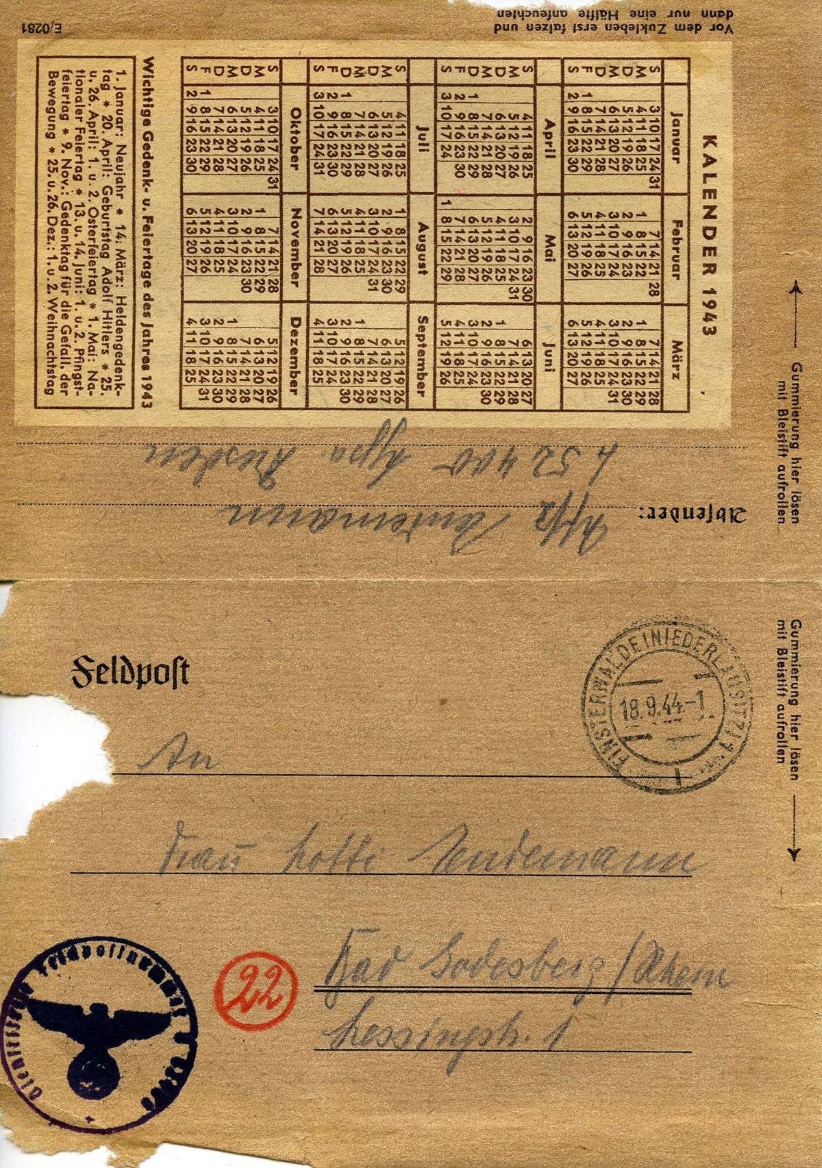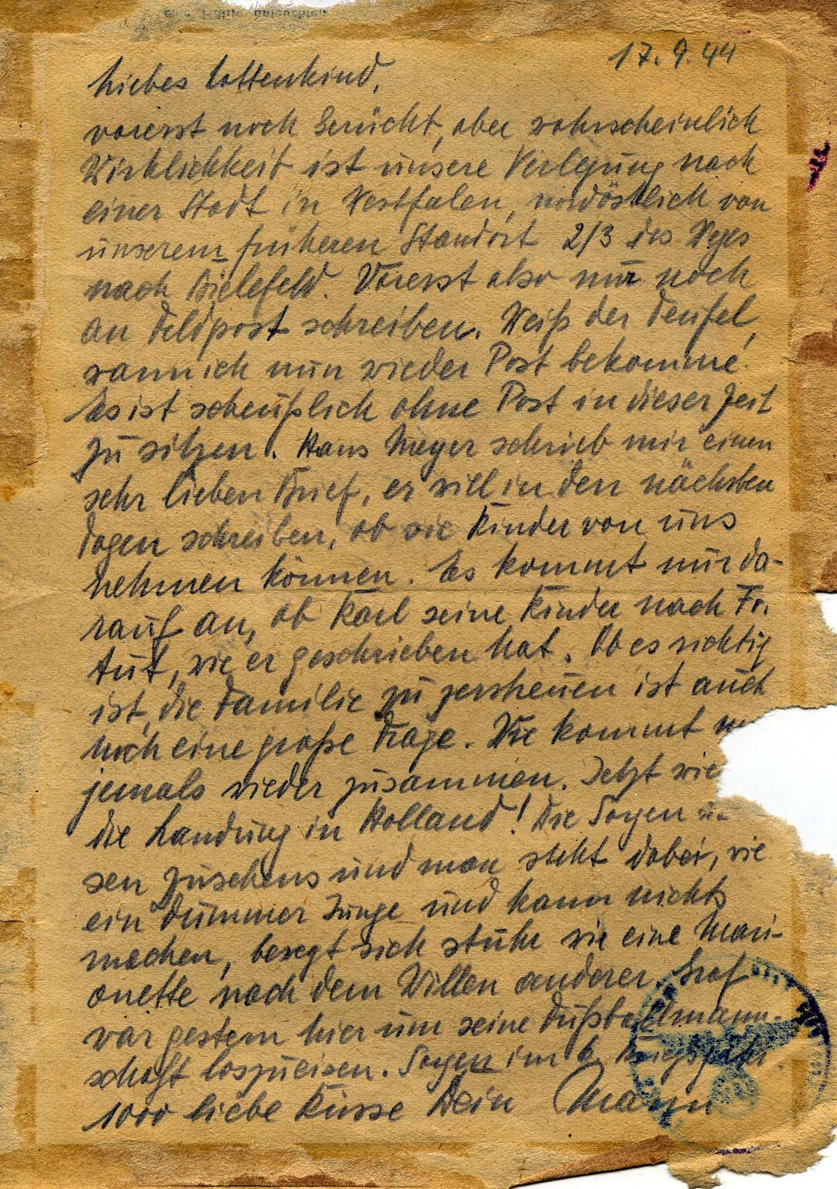 vorerst noch Gerücht, aber wahrscheinlich Wirklichkeit ist unsere Verlegung nach einem Horst in Westfalen, nordöstlich von unserem früheren Standpunkt 2/3 des Weges nach Bielefeld. Vorerst also nur noch an Feldpost schreiben. Weiß der Teufel, wann ich nun wieder Post bekomme! Es ist scheußlich ohne Post in dieser Zeit (?) zu sitzen. Hans Meyer schrieb mir einen sehr lieben Brief, er will in den nächsten Tagen schreiben , ob sie Kinder von uns nehmen können. Es kommt nur darauf an, ob Karl seine Kinder nach Fr. tut, wie er geschrieben hat. Ob es nötig ist, die Familie zu zerstreuen ist auch noch eine große Frage. Wie kommt man jemals wieder zusammen. Jetzt wieder die Landung in Holland! Die Sorgen wachsen zusehends und man steht dabei wie ein dummer Junge und kann nichts machen, Man bewegt sich stuhr (!) wie eine Marionette nach den Willen anderer. Graf (?) war gestern hier um seine Fußballmannschaft loszueisen. Sorgen im 6. Kriegsjahr.