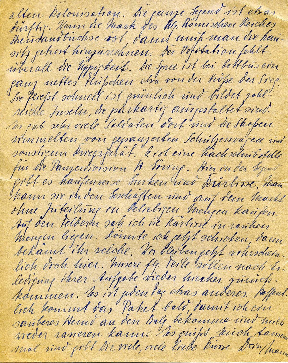 alten Kolonisation. Die ganze Gegend ist etwas dürftig. Wenn die Mark des Hlg. Römischen Reiches Streusandbüchse ist, dann muß man die Lausitz getrost hinzunehmen. Der Vegetation fehlt überall die Üppigkeit. Die Spree ist bei Cottbus ein ganz nettes Flüßchen etwa von der Größe der Sieg. Sie fließt schnell ist grünlich und bildet zahlreiche Inseln, die parkartig ausgestaltet sind. Es gab sehr viele Soldaten dort und die Straßen wimmelten von gepanzerten Schützenwagen und sonstigem Kriegsgerät. Es ist eine Nachschubstelle für die Panzerdivision H. Göring. Hier in der Gegend gibt es haufenweise Gurken und Kürbisse. Man kann sie in den Geschäften und auf dem Markt in beliebigen Mengen kaufen. Auf den Feldern sehe ich die Kürbisse in rauhen Mengen liegen: könnte ich jetzt schicken, dann bekämt Ihr welche. Wir bleiben jetzt vermutlich doch hier. Unser flg. (fliegenden)Teile sollen nach Erledigung ihrer Aufgabe wieder hierher zurückkommen. Es ist jeden Tag etwas anderes. Hoffentlich kommt das Paket bald, damit ich ein sauberes Hemd an den Balg bekomme und mich wieder rasieren kann.