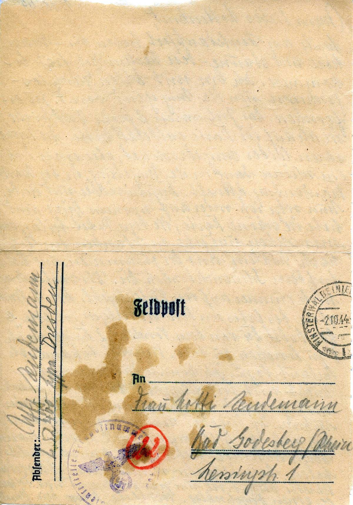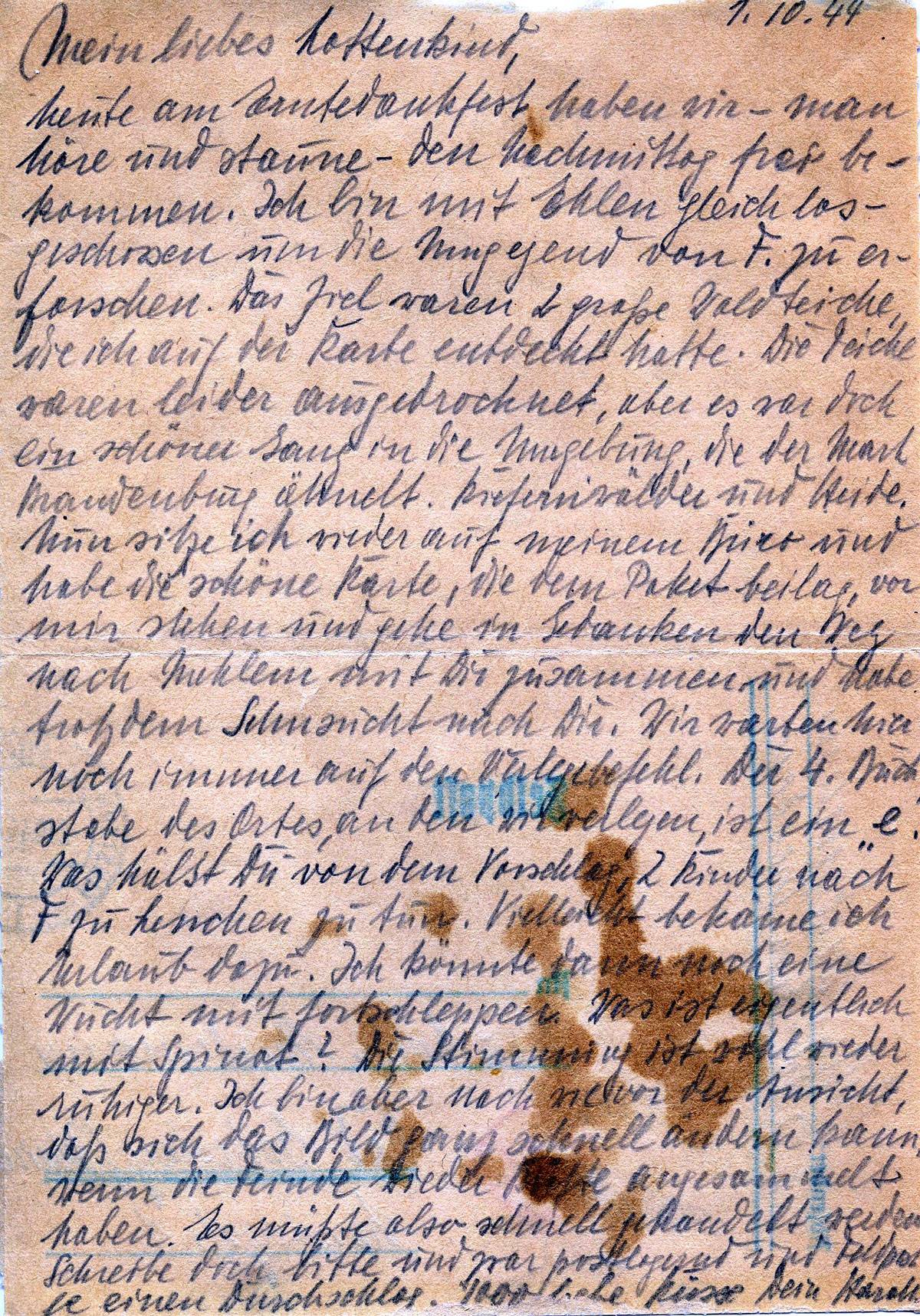 heute am Erntedankfest haben wir – man höre und staune – den Nachmittag frei bekommen. Ich bin mit Ehlen gleich losgeschossen um die Umgegend von F. zu erforschen. Das Ziel waren 2 große Waldteiche, die ich auf der Route entdeckt hatte. Die Teiche waren leider ausgetrocknet, aber es war doch eins schöner Gang in die Umgebung, die der Mark Brandenburg ähnelt. Kiefernwälder und Heide. Nun sitze ich wieder auf meinem Büro und habe die schöne Karte, die dem Paket beilag, vor mir stehen und gehe in Gedanken den Weg nach Mehlem mit Dir zusammen und habe trotzdem Sehnsucht nach Dir. Wir warten hier noch immer auf den Verlegungsbefehl. Der 4. Buchstabe des Ortes, an den wir verlegen, ist ein „e“. Was hälst Du von dem Vorschlag 2 Kinder nach F zu Lenchen zu tun. Vielleicht bekäme ich Urlaub dazu. Ich könnte dann noch eine Wucht mit fortschleppen. Was ist eigentlich mit Spinat? Die Stimmung ist wohl wieder ruhiger. Ich bin aber nach wie vor der Ansicht, daß sich das Bild ganz schnell wenden kann, wenn die Feinde wieder Kräfte angesammelt haben. Es müsste aber schnell gehandelt werden. Schreibe doch bitte und zwar postlagernd und Feldpost u einen Durchschlag.