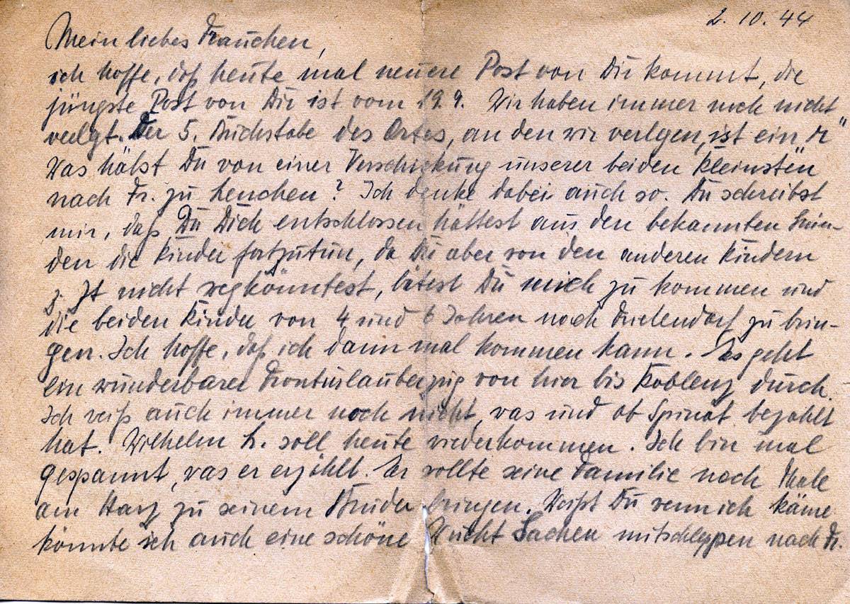 ich hoffe, daß heute mal Post von Dir kommt, die jüngste Post von Dir ist vom 29.9. Wir haben immer noch nicht verlegt. Der 5. Buchstabe des Ortes, an den wir verlegen, ist ein „m“. Was hälst Du von einer Verschickung unserer beiden kleinsten nach Fr. zu Lenchen? Ich denke dabei auch so. Du schreibst mir, daß Du Dich entschlossen hättest aus den bekannten Gründen die Kinder fortzutun, da Du aber von den anderen Kindern z.Zt. nicht wegkönntest, bätest Du mich zu kommen und die beiden Kinder von 4 und 6 Jahren nach Frielendorf zu bringen. Ich hoffe, daß ich dann mal kommen kann. Es geht ein wunderbarer Fronturlauberzug von hier bis Koblenz durch. Ich weiß auch immer noch nicht, was und ob Spinat bezahlt hat: Wilhelm L. soll heute wiederkommen. Ich bin mal gespannt, was er erzählt: Er sollte seine Familie nach Thale am Harz zu seinem Bruder bringen. Weißt Du wenn ich käme könnte ich auch eine schöne Wucht Sachen mitschleppen nach Fr.