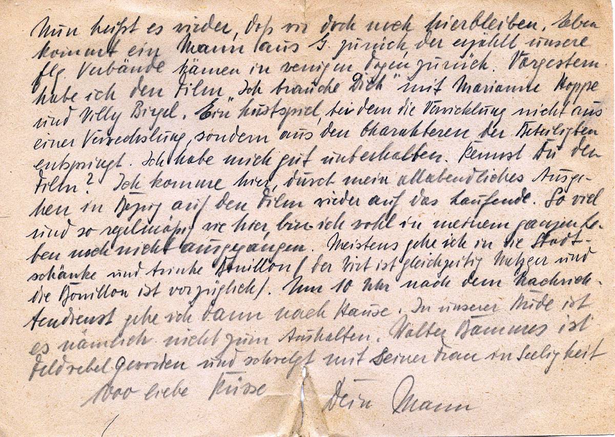 Nun heißt es wieder, daß wir hierbleiben. Eben kommt ein Mann aus G. zurück, der erzählt unsere flg. Verbände kämen in wenigen Tagen zurück. Vorgestern habe ich den Film „Ich brauche Dich“ mit Marianne Hoppe und Willy Birgel (sc. gesehen). Ein Lustspiel, bei dm die Verwicklung nicht aus einer Verwechslung, sondern aus den Charakteren der Beteiligten entspringt. Ich habe mich gut unterhalten. Kennst Du den Film? Ich komme hier, durch mein allabendliches Ausgehen in Bezug auf den Film wieder auf das Laufende. So viel und so regelmäßig wie hier, bin ich wohl in meinem ganzen Leben noch nicht ausgegangen. Meistens gehe ich in die Stadtschänke und trinke Bouillon (der Wirt ist gleichzeitig Metzger und die Bouillon ist vorzüglich). Um 10 Uhr nach dem Nachrichtendienst gehe ich dann nach Hause. In unserer Bude ist es nämlich nicht zum Aushalten. Walter Bammes ist Feldwebel geworden und schwelgt mit seiner Frau in Seeligkeit.