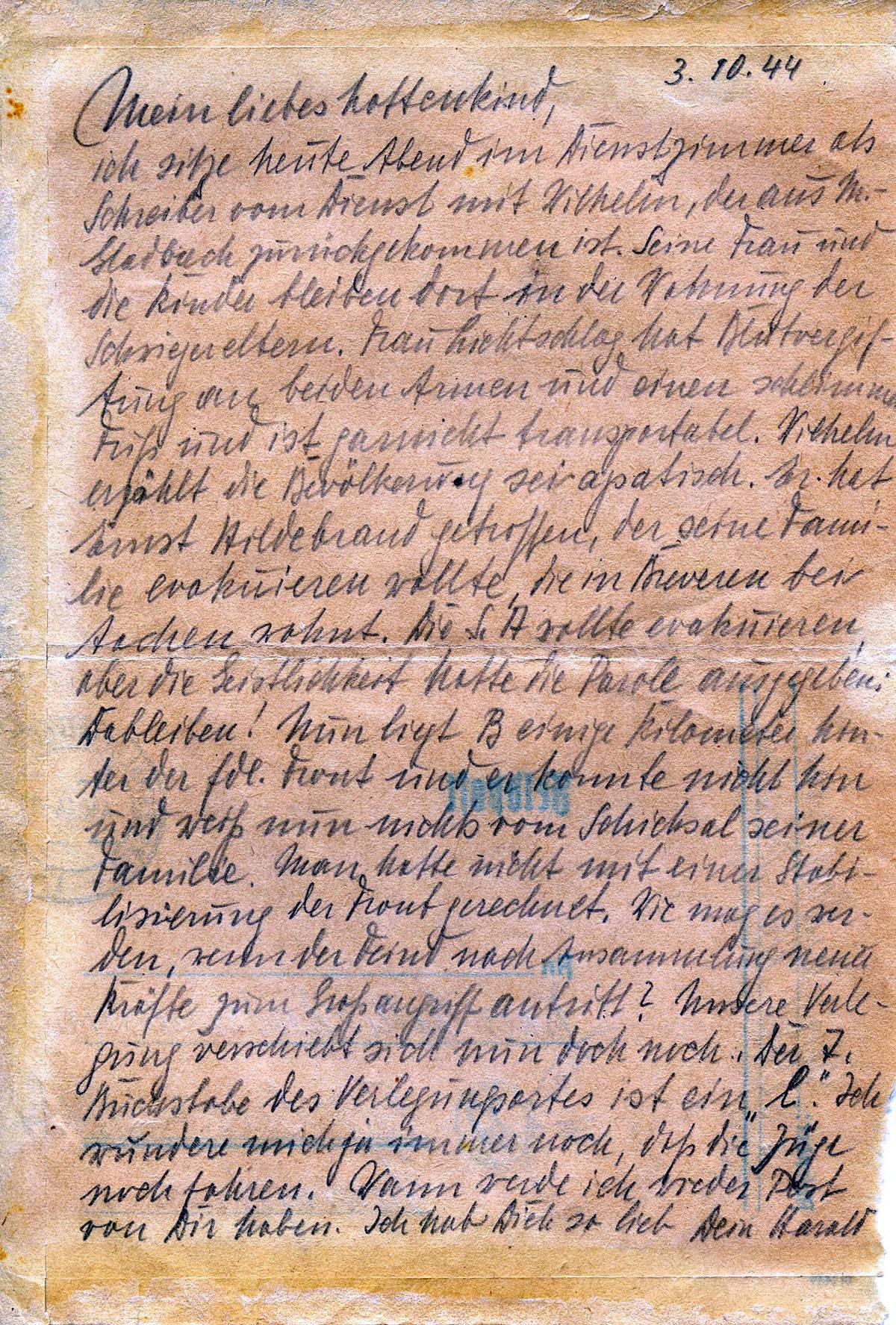ich sitze heute Abend im Dienstzimmer als Schreiber vom Dienst mit Wilhelm, der aus M.-Gladbach zurückgekommen ist. Seine Frau und die Kinder bleiben dort in der Wohnung der Schwiegereltern. Frau Lichtschlag hat Blutvergiftung an beiden Armen und einen schlimmen Fuß und ist garnicht transportabel. Wilhelm erzählt die Bevölkerung sei apatisch. Er hat Ernst Hildebrand getroffen, der seine Familie evakuieren wollte, die in (B..?) bei Aachen wohnt. Die SD.A. sollte evakuieren, aber die Geistlichkeit hatte die Parole ausgegeben:; Dableiben! Nun liegt B. einige Kilometer hinter der fdl. Front und er konnte nicht hin und weiß nun nichts von dem Schicksal seiner Familie. Man hatte nicht mit einer Stabilisierung der Front gerechnet. Wie mag es werden wenn der Feind nach Ansammlung neuer Kräfte zum Großangriff antritt? Unsere Verlegung verschiebt sich nun doch. Der 7. Buchstabe des Verlegungsortes ist ein „l“. Ich wundere mich immer noch, daß die Züge noch fahren. Wann werde ich wieder Post von Dir haben? Ich habe Dich so lieb.