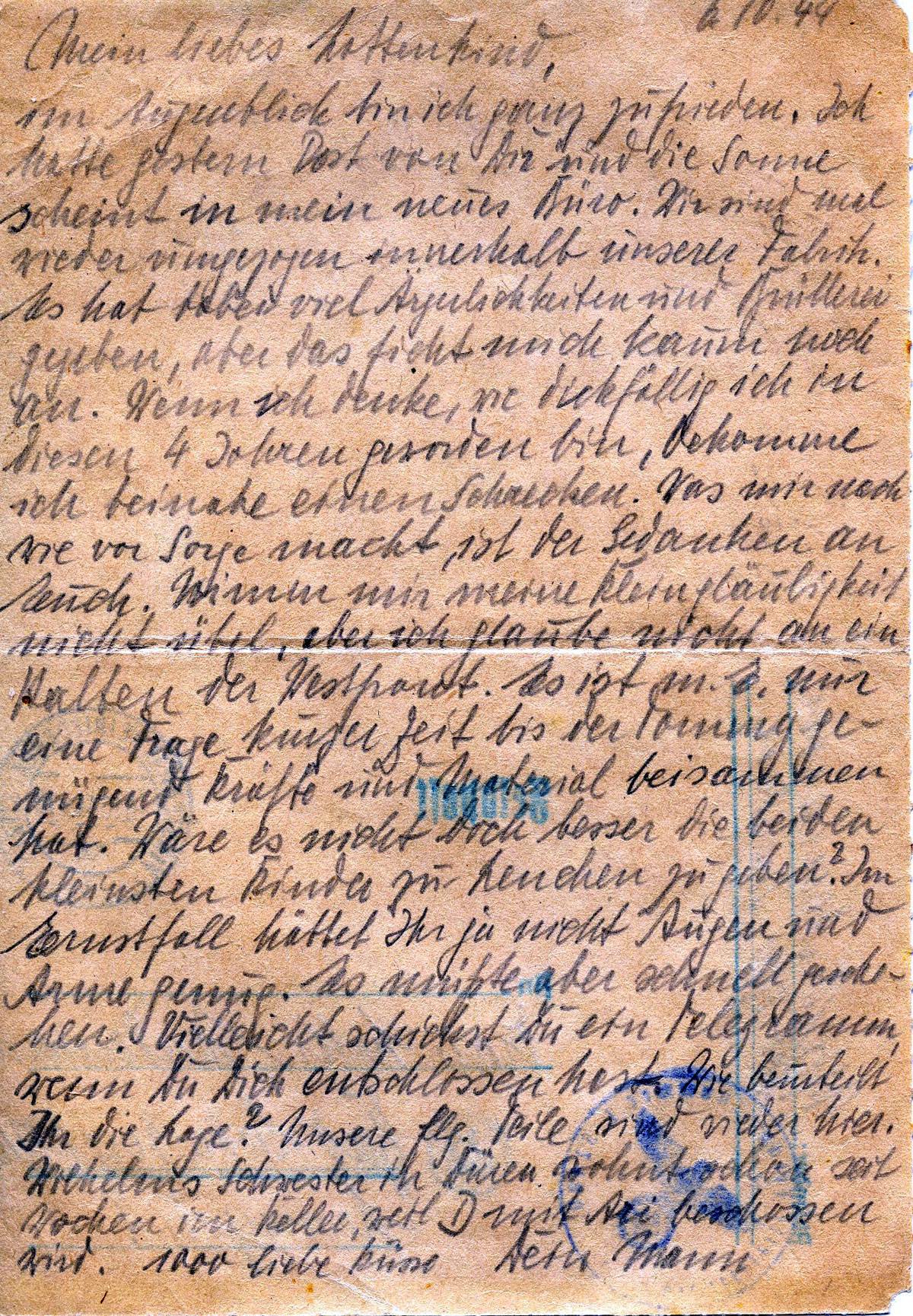 im Augenblick bin ich ganz zufrieden. Ich hatte gestern Post von Dir und die Sonne scheint in mein neues Büro. Wir sind mal wieder umgezogen innerhalb unserer Fabrik. Es hat dabei viel Ärgerlichkeiten mit Brüllerei gegeben, aber das ficht mich kaum noch an. Wenn ich denke, wie dickfällig (!) ich in diesen 4 Jahren geworden bin, bekomme ich beinahe einen Schrecken. Was mir nach wie vor Sorge macht, ist der Gedanken an Euch. Nimm mir meine Kleingläubigkeit nicht übel, aber ich glaube nicht an ein Halten der Westfront. Es ist m.E. nur eine Frage kurzer Zeit bis der Tommy genügend Kräfte und Material beisammen hat. Wäre es nicht besser, die beiden kleinsten Kinder zu Lenchen zu geben? Im Ernstfall hättet Ihr ja nicht Augen und Arme genug. Es müsste aber schnell gehen. Vielleicht schickst Du ein Telegramm, wenn Du Dich entschlossen hast. Wir beurteilt Ihr die Lage? Unsere flg. (fliegenden) Teile sind wieder hier. Wilhelms Schwester in Düren wohnt schon seit Wochen im Keller, weil D(.) mit (Ari?) beschossen wird.