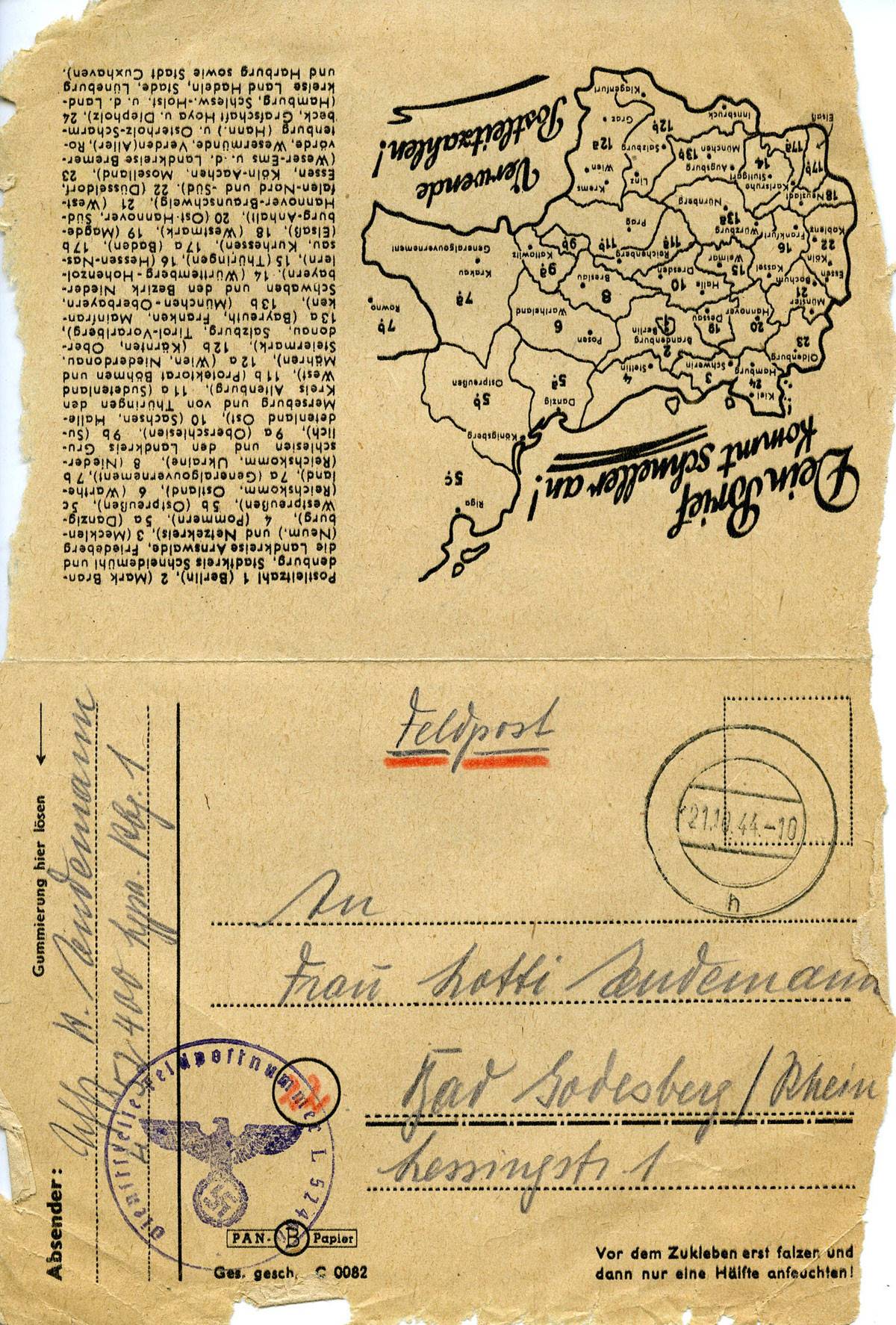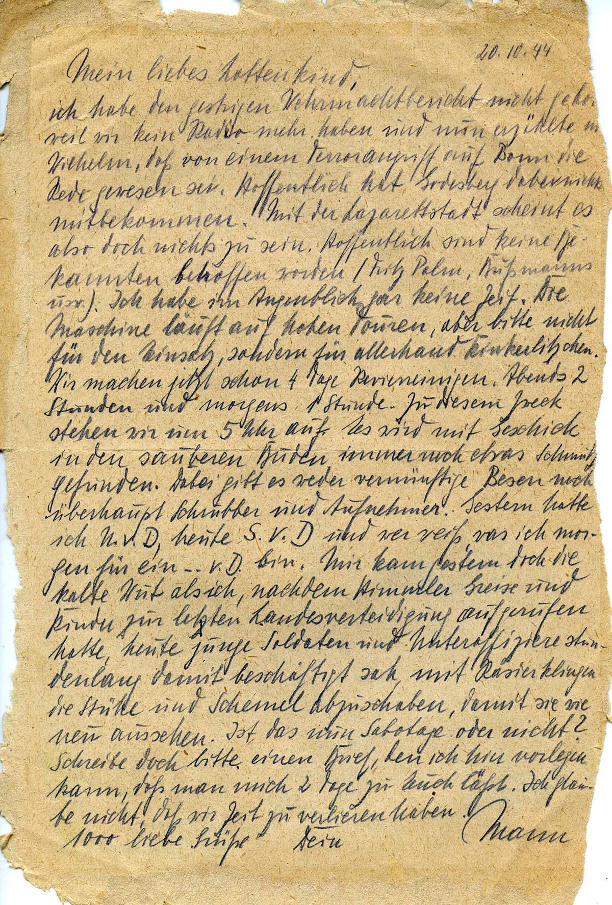 ich habe den gestrigen Wehrmachtbericht nicht gehört, weil wir kein Radio mehr haben und nun erzählte mir Wilhelm, daß von einem Terrorangriff auf Bonn die Rede gewesen sei. Hoffentlich hat Godesberg dabei nichts mitbekommen. Mit der Lazarettstadt scheint es also doch nichts zu sein. Hoffentlich sind keine Bekannten betroffen worden (Fritz Palm, Bußmanns usw.) Ich habe im Augenblick gar keine Zeit. Die Maschine läuft auf hohen Touren, aber bitte nicht für den Einsatz, sondern für allerhand Kinkerlitzchen. Wir machen jetzt schon 4 Tage Revierreinigen. Abends 2 Stunden und morgens eine Stunde. Z diesem Zweck stehen wir u 5 Uhr auf. Es wird mit Geschick in den sauberen Buden immer noch etwas Schmutz gefunden. Dabei gibt es weder vernünftige Besen noch überhaupt Schrubber und Aufnehmer. Gestern hatte ich U.v.D., heute S.v.D. Und wer weiß, was ich morgen für ein ...v.D. bin. Mir kam gestern doch die kalte Wut als ich, nachdem Himmler Kinder und Greise zur letzten Landesverteidigung aufgerufen hatte, heute junge Soldaten und Unteroffiziere stundenlang damit beschäftigt sah, mit Rasierklingen die Stühle und Schemel abzuschaben, damit sie wie neu aussehen. Ist das nun Sabotage oder nicht? Schreibe doch bitte einen Brief, den ich hier vorlegen kann,, daß man mich 2 Tage zu Euch läßt. Ich glaube nicht, daß wir Zeit zu verlieren haben.
