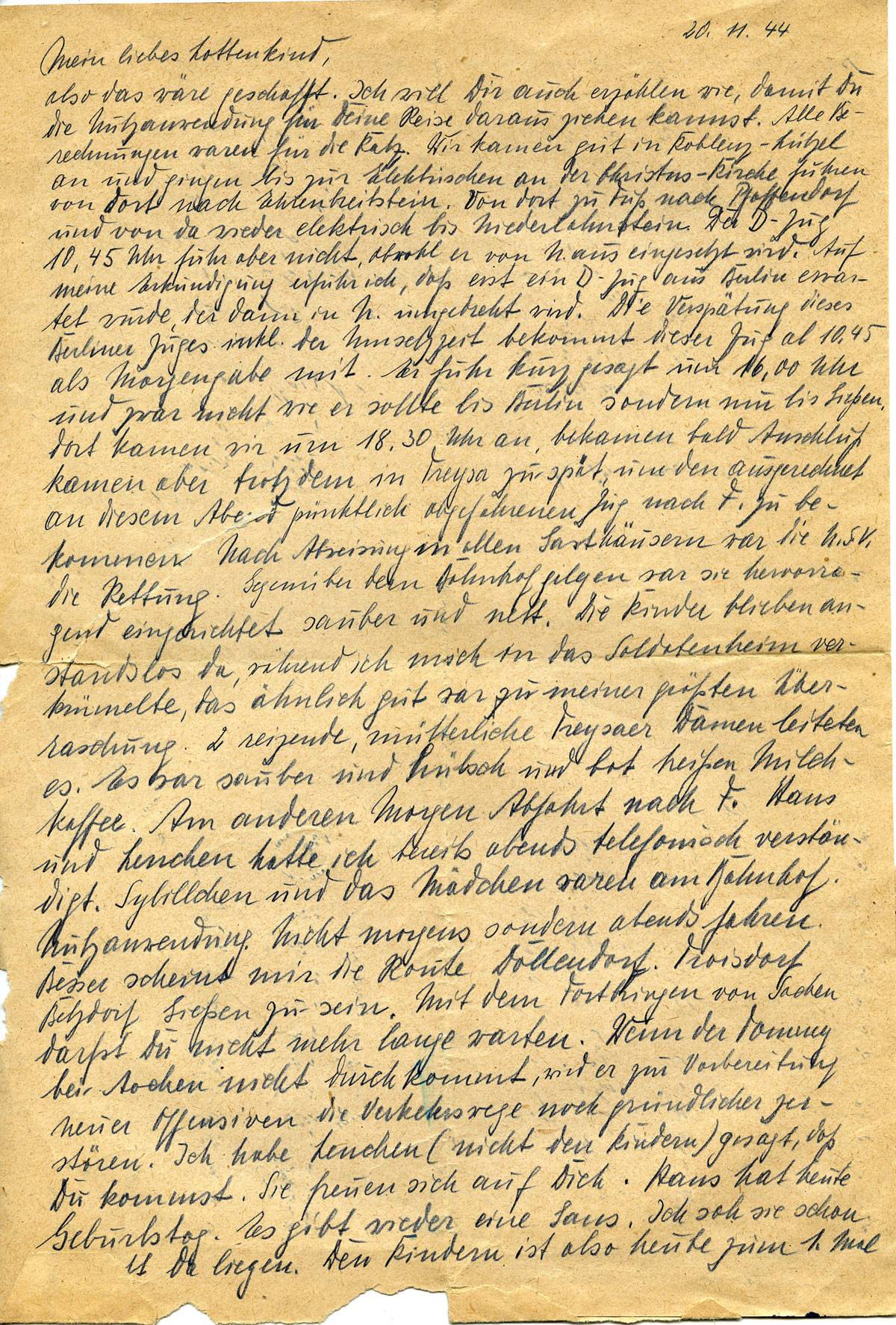 also das wäre geschafft. Ich will Dir auch erzählen wie, damit Du die Nutzanwendung für Deine Reise daraus ziehen kannst. Alle Berechnungen waren für die Katz. Wir kamen gut in Koblenz-Lützel an und gingen bis zur Elektrischen an der Christus-Kirche (,) fuhren von dort nach Ehrenbreitstein. Von dort zu Fuß nach Pfaffendorf und von da elektrisch wieder nach Niederlahnstein. Der D-Zug 10,45 fuhr aber nicht, obwohl er von N. aus eingesetzt wird. Auf meine Ankündigung erfuhr ich, daß erst ein D-Zug aus Berlin erwartet wurde, der dann in N. umgekehrt wird. Die Verspätung des Berliner Zuges inkl. der Umsetzzeit bekommt dieser Zug ab 10.45 als Morgengabe mit. Er fuhr kurz gesagt um 16, 00 Uhr und zwar nicht wie er sollte nach Berlin sondern nur bis Gießen. Dort kamen wir um 18,30 Uhr an, bekamen fast Anschluß kamen aber trotzdem in Treysa zu spät, um den ausgerechnet an diesem Abend pünktlich abgefahrenen Zug nach F. zu bekommen. Nach Abweisung in allen Gasthäusern war die N.S.V. die Rettung. Gegenüber dem Bahnhof gelegen war sie hervorragend eingerichtet sauber und nett. Die Kinder blieben anstandslos da, während ich mich in das Soldatenheim verkrümelte, das ähnlich gut war zu meiner größten Überraschung. 2 reizende mütterliche Treysaer Damen leiteten es. Es war sauber und hübsch und hat heißen Milchkaffee. Am anderen Morgen Abfahrt nach F. Hans und Lenchen hatte ich bereits abends telefonisch verständigt. Sybillchen und das Mädchen waren am Bahnhof. Nutzanwendung:Nicht morgens sondern abends fahren. Besser scheint mir: Die Route Dollendorf, Troisdorf, Betzdorf Gießen zu sein. Mit dem Fortbringen von Sachen darfst Du nicht mehr lange warten. Wenn der Tommy bei Aachen nicht durchkommt, wird er zur Vorbereitung neuer Offensiven die Verkehrswege noch gründlicher zerstören. Ich habe Lenchen (nicht den Kindern) gesagt, daß Du kommst. Sie freuen sich auf Dich. Hans hat heute Geburtstag. Es gibt wieder eine Gans. Ich sah sie schon gerupft (?) da liegen. Den Kindern ist also heute zum 1. Mal