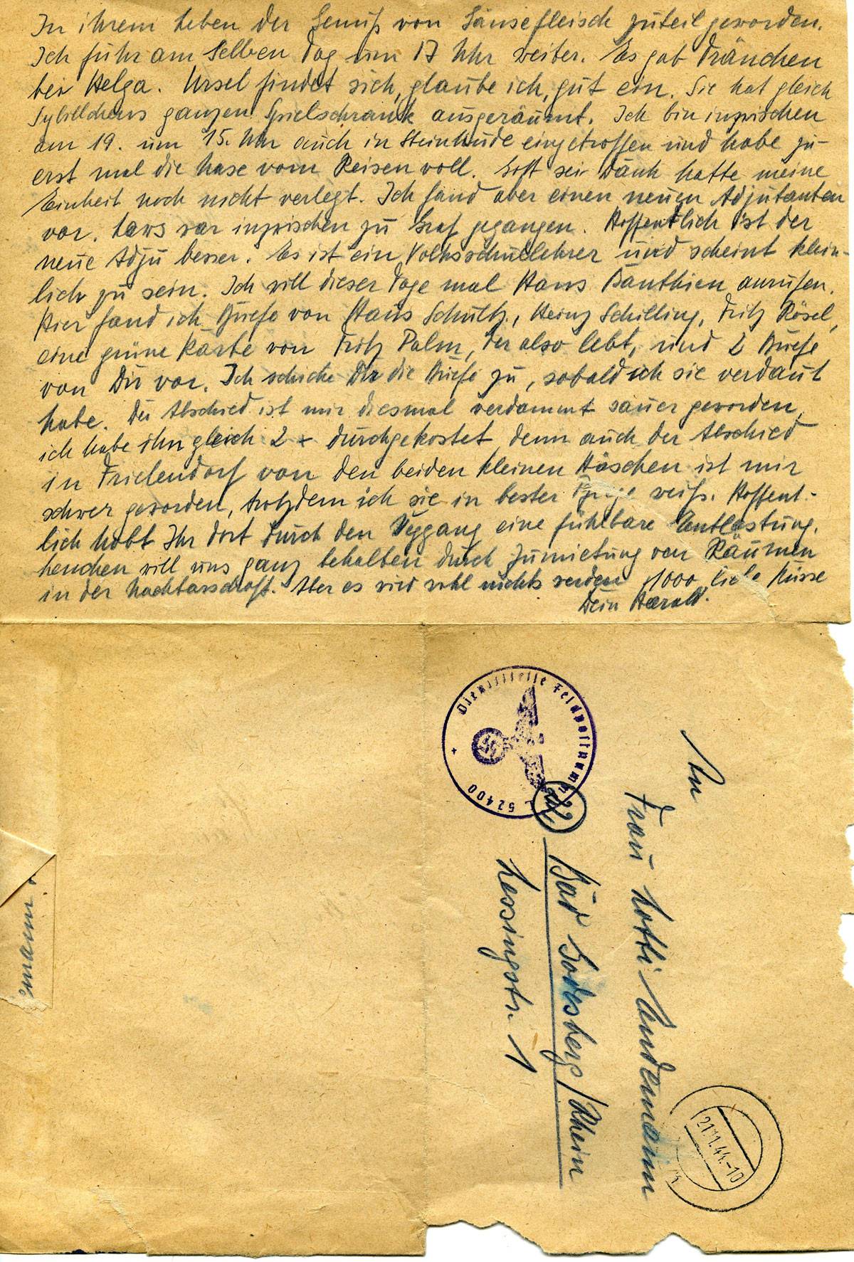 in ihrem Leben der Genuß von Gänsefleisch zuteil geworden. Ich fuhr am selben Tag um 17 Uhr weiter. Es gab Tränchen bei Helga. Ursel findet sich, glaube ich, gut ein. Sie hat gleich Sybillchens ganzen Spielschrank ausgeräumt. Ich bin inzwischen am 19. um 15 Uhr auch in Steinhude eingetroffen und habe zuerst mal die Nase vom Reisen voll. Gott sei Dank hatte meine Einheit noch nicht verlegt. Ich fand aber einen neuen Adjutanten vor. Laws (?) war inzwischen zu Graf gegangen. Hoffentlich ist der neue Adjutant besser.! Es ist ein Volksschullehrer und scheint kleinlich zu sein. Ich will dieser Tage mal Hans Benthien anrufen. Hier fand ich Briefe von Hans Schultz, Heinz Schilling, Fritz Rösel, eine grüne Karte von Fritz Palm, der also lebt, und 2 Briefe von Dir vor. Ich schicke Dir die Brief zu, sobald ich sie verdaut habe. Der Abschied ist mir diesmal verdammt sauer geworden, ich habe ihn gleich 2x durchgekostet, denn auch der Abschied in Frielendorf von den beiden kleinen Häschen ist mir schwer geworden, trotzdem ich sie in bester Pflege weiß. Hoffentlich habt Ihr dort durch den Weggang eine fühlbare Entlastung. Lenchen will uns ganz behalten durch Zumietung von Räumen in der Nachbarschaft. Aber es wird wohl nichts werden.