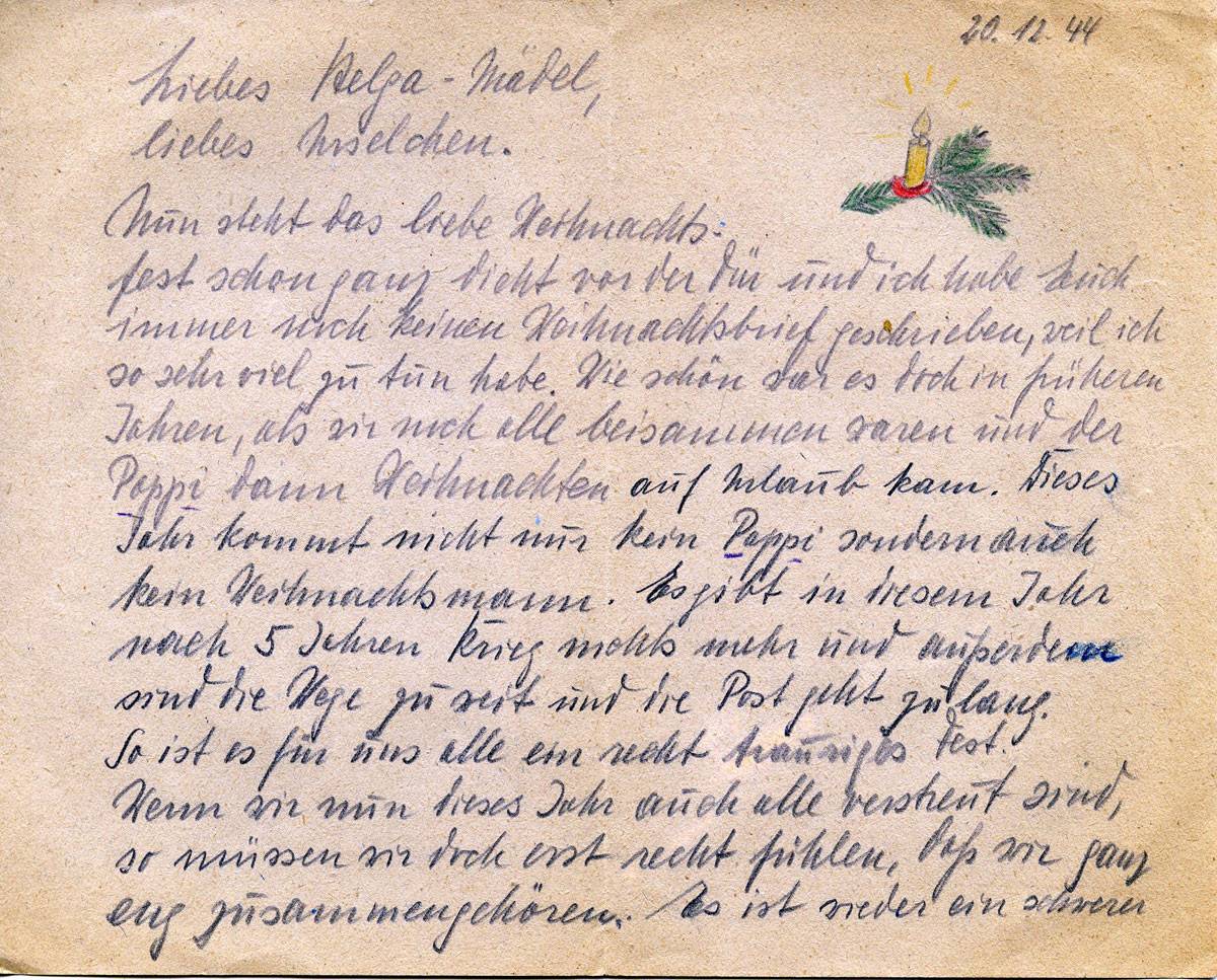 Nun steht das liebe Weihnachtsfest schon ganz dicht vor der Tür und ich habe Euch immer noch keinen Weihnachtsbrief geschrieben, weil ich so sehr viel tu tun habe. Wie schön war es doch in früheren Jahren, als wir alle beisammen waren und der Pappi dann Weihnachten auf Urlaub kam. Diese Jahr kommt nicht nur kein Pappi sondern auch kein Weihnachtsmann. Es gibt in diesem Jahr nach 5 Jahren Krieg nichts mehr und die Post geht zu lang. So ist es für uns alle ein recht trauriges Fest! Wenn wir nun dieses Jahr auch alle verstreut sind, so müssen wir doch erst recht fühlen, daß wir ganz eng zusammengehören. Es ist wieder ein schwerer