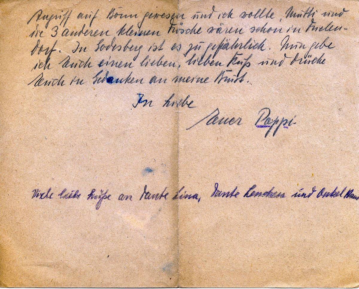 Angriff auf Bonn gewesen und ich wollte, Mutti und die 3 anderen kleinen Kinder wären schon in Frielendorf. In Godesberg ist es zu gefährlich. Nun gebe ich Euch einen lieben, lieben Kuß und drücke Euch in Gedanken an meine Brust.