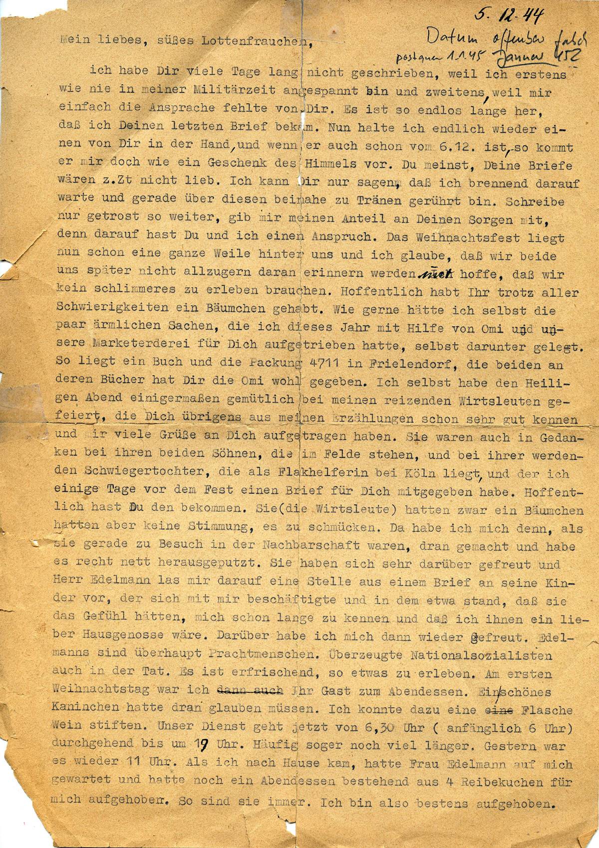 Ich habe Dir viele Tage lang nicht geschrieben, weil ich 1. wie nie in meiner Militärzeit angespannt bin und 2., weil mir einfach die Ansprache fehlte von Dir. Es ist so endlos lange her, daß ich Deinen letzten Brief bekam. Nun halte ich endlich wieder einen von Dir in der Hand, und wenn er auch schon vom 6. 12.ist, so kommt er mir doch wie ein Geschenk des Himmels vor. Du meinst, Deine Briefe wären z.Zt. nicht lieb. Ich kann Dir nur sagen, dass ich brennend darauf wachte und gerade über diesen beinahe zu Tränen gerührt bin. Schreibe nur getrost so weiter, gibt mir meinen Anteil an Deinen Sorgen mit, denn darauf hast Du und ich einen Anspruch. Das Weihnachtsfest liegt nun schon eine ganze Weile hinter uns und ich glaube, dass wir beide uns später nicht allzu gern daran erinnern werde. Ich hoffe, dass wir kein schlimmeres zu erleben brauchen. Hoffentlich habt Ihr trotz aller Schwierigkeiten ein Bäumchen gehabt. Wie gerne hätte ich selbst die paar ärmlichen Sachen, die ich dieses Jahr mithilfe von Omi und unserer Marketenderei für Dich aufgetrieben hatte, selbst darunter gelegt. So liegt ein Buch und die Packung 4711 in Frielendorf, die beiden anderen Bücher hat Dir die Omi wohl gegeben. Ich selbst habe den Heiligen Abend einigermaßen gemütlich bei meinen reizenden Wirtsleuten gefeiert, die Dich übrigens aus meinen Erzählungen schon sehr gut kennen und mir viele Grüße an Dich aufgetragen haben. Sie waren auch in Gedanken bei ihren beiden Söhnen, die im Felde stehen, und bei ihrer werdenden Schwiegertochter, die als Flakhelferin bei Köln liegt, und der ich einige Tage vor dem Fest einen Brief für Dich mitgegeben habe. Hoffentlich hast Du den bekommen. Sie (die Wirtsleute) hatten zwar ein Bäumchen hatten aber keine Stimmung, es zu schmücken. Da habe ich mich denn, als sie gerade zu Besuch in der Nachbarschaft waren, dran gemacht und habe es recht nett herausgeputzt. Sie haben sich sehr darüber gefreut und Herr Edelmann las mir darauf eine Stelle aus einem Brief an seine Kinder vor, der sich mit mir beschäftigte und in dem etwa stand, dass sie das Gefühl hätten, mich schon lange zu kennen und dass ich Ihnen ein lieber Hausgenosse wäre. Darüber habe ich mich dann wieder gefreut. Edelmanns sind überhaupt Prachtmenschen. Überzeugte Nationalsozialisten auch in der Tat. Es ist erfrischend, so etwas zu erleben. Am 1. Weihnachtstag war ich (dann auch, gestr.) ihr Gast zum Abendessen. Ein schönes Kaninchen hat dran glauben müssen. Ich konnte dazu eine Flasche Wein stiften. Unser Dienst wird jetzt von 6,30 Uhr (anfänglich 6 Uhr) durchgehend bis um 19:00 Uhr. Häufig sogar noch viel länger. Gestern war es wieder 11 Uhr. Als ich nach Hause kam, hatte Frau Edelmann auf mich gewartet und hatte noch ein Abendessen bestehend aus 4 Reibekuchen für mich aufgehoben. So sind sie immer. Ich bin also bestens aufgehoben,