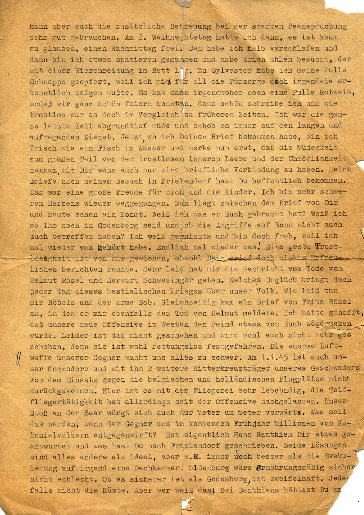 kann aber auch die zusätzliche Betreuung bei der starken Beanspruchung sehr gut gebrauchen. Am 2. Weihnachtstag hatte ich dann, es ist kaum zu glauben, einen Nachmittag frei. Den habe ich halb verschlafen und dann bin ich etwas spazieren gegangen und habe Erich Ehlen besucht, der mit einer Nierenreizung im Bett lag. Zu Sylvester habe ich meine Pulle Schnapps geopfert, weil ich mich für all die Fürsorge doch irgendwie erkenntlich zeigen musste. Es kam dann irgendwo her noch eine Pulle Rotwein, sodass wir ganz schön feiern konnten. Ganz schön schreibe ich und wie trostlos war es doch im Vergleich zu früheren Zeiten. Ich war die ganze letzte Zeit abgrundtief müde und schob es immer auf den langen und aufregenden Dienst. Jetzt, wo ich Deinen Brief bekommen habe, bin ich frisch wie ein Fisch im Wasser und merken nun erst, dass die Müdegkeit zum großen Teil von der trostlosen inneren Leere und der Unmöglichkeit herkam, mit Dir wenn auch nur eine briefliche Verbindung zu haben. Meine Briefe nach meinem Besuch in Frielendorf hast Du hoffentlich bekommen. Das war eine große Freude für mich und die Kinder ich bin sehr schweren Herzens wieder weggegangen. Nun liegt zwischen dem Brief von Dir und heute schon ein Monat. Weiß ich was er Euch gebracht hat? Weiß ich ob Ihr noch in Godesberg seit und ob die Angriffe auf Bonn nicht auch euch betroffen haben. Ich weiß garnichts und bin doch froh, weil ich mal wieder was gehört habe. Endlich mal wieder was! Eine große Trostlosigkeit ist von mir gewichen, obwohl Dein Brief doch nichts Erfreuliches berichten konnte. Sehr leid hat mir die Nachricht vom Tode von Helmut Rösel und Herward Schlesinger getan. Welches Unglück bringt doch jeder Tag dieses bestialischen Krieges über unser Volk. Wie leid tun mir Rösels und der arme Bob. Gleichzeitig kam ein Briefe von Fritz Rösel an, indem er mir ebenfalls den Tod von Helmut meldete. Ich hatte gehofft, dass unsere neue Offensive im Westen den Feind etwas von Euch weg drücken würde. Leider ist das nicht geschehen und wird wohl auch nicht mehr geschehen, denn sie ist wohl rettungslos festgefahren. Die enorme Luftwaffe unserer Gegner macht uns alles zu schwer. Am 1.1. 45 ist auch unser Kommodore (Specht) und mit ihm 2 weitere Ritterkreuzträger unseres Geschwaders von dem Einsatz gegen die belgischen und holländischen Flugplätze nicht zurückgekommen. Hier ist es mit der Fliegerei sehr lebendig, die Tieffliegerei hat allerdings seit der Offensive nachgelassen. Unser Stoß an der Saar wirkt sich auch nur Meter um Meter vorwärts. Was soll das werden, wenn der Gegner uns im kommenden Frühjahr Millionen von Kolonialvölkern entgegenwirft? Hat eigentlich Hans Banthien Dir etwas geantwortet und was hast Du nach Frielendorf geschrieben. Beide Lösungen sind alles andere als ideal, aber m.E. immer noch besser als die Evakuierung auf irgend eine Dachkammer. Oldenburg wäre ernährungsmäßig sicher nicht schlecht. Ob es sicherer ist als Godesberg, ist zweifelhaft jedenfalls nicht die Küste. Aber wer weiß das! Bei Banthiens hättest Du am