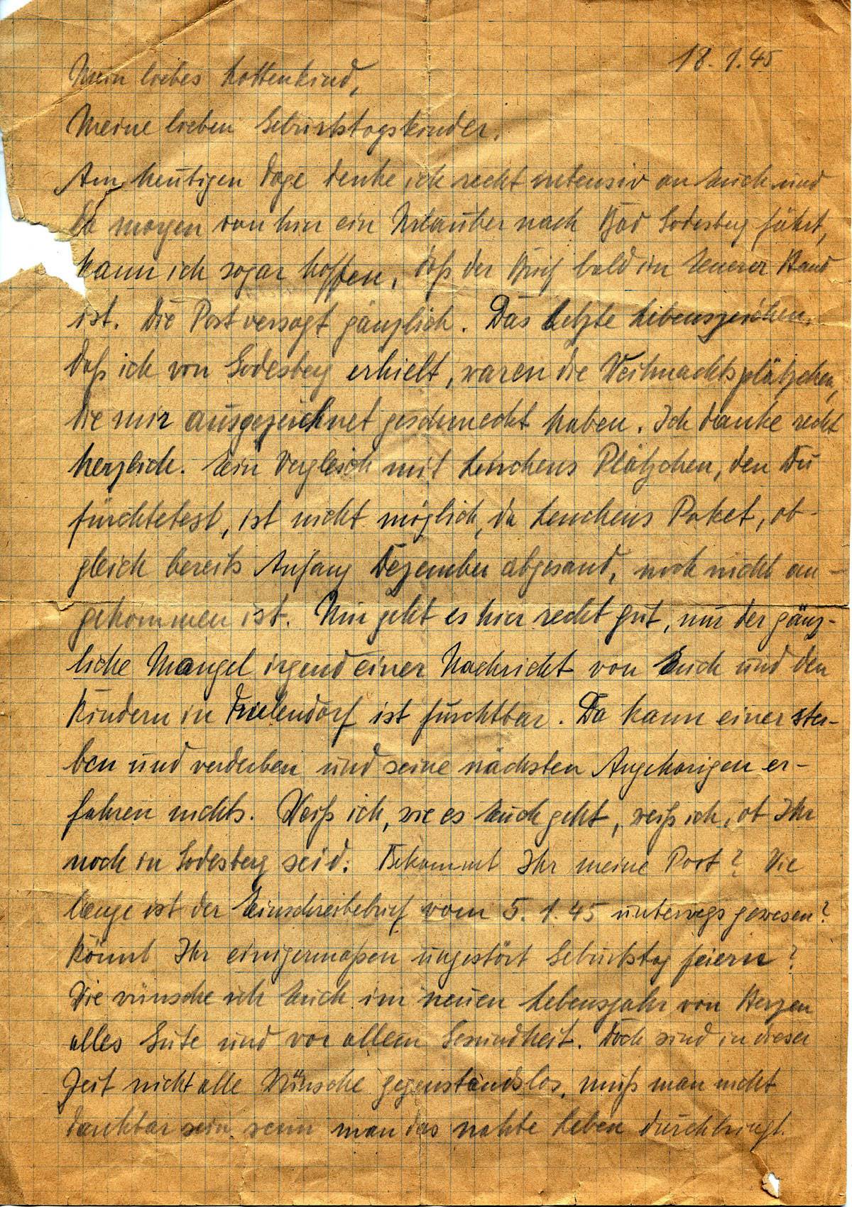 am heutigen Tage denke ich recht intensiv an Euch und da morgen von hier ein Urlauber nach Bad Godesberg fährt, kann ich sogar hoffen, dass der Brief bald in Euerer Hand die Post versagt gänzlich. Das letzte Lebenszeichen, daß ich von Godesberg erhielt, waren die Weihnachtsplätzchen, die mir ausgezeichnet geschmeckt haben. Ich danke recht herzlich. Ein Vergleich mit Lenchens Plätzchen, den Du fürchtetest, ist nicht möglich, da Lenchens Paket, obgleich bereits Anfang Dezember abgesand, noch nicht angekommen ist. Mir geht es hier recht gut, nur der gänzliche Mangel irgend einer Nachricht von Euch und den Kindern in Frielendorf ist furchtbar. Da kann einer sterben und verderben und seine nächsten Angehörigen erfahren nichts. Weiß ich, wie es Euch geht, weiß ich, ob Ihr noch in Godesberg seid. Bekommt Ihr meine Post? Wie lange ist der Einschreibebrief vom 5.1.1945 unterwegs gewesen? Könnt Ihr einigermaßen ungestört Geburtstag feiern? Wie wünsche ich Euch im neuen Lebensjahr von Herzen alles Gute und vor allem Gesundheit. Doch sind in dieser Zeit nicht alle Wünsche gegenstandslos, muss man nicht dankbar sein, wenn man das nackte Leben durchbringt.
