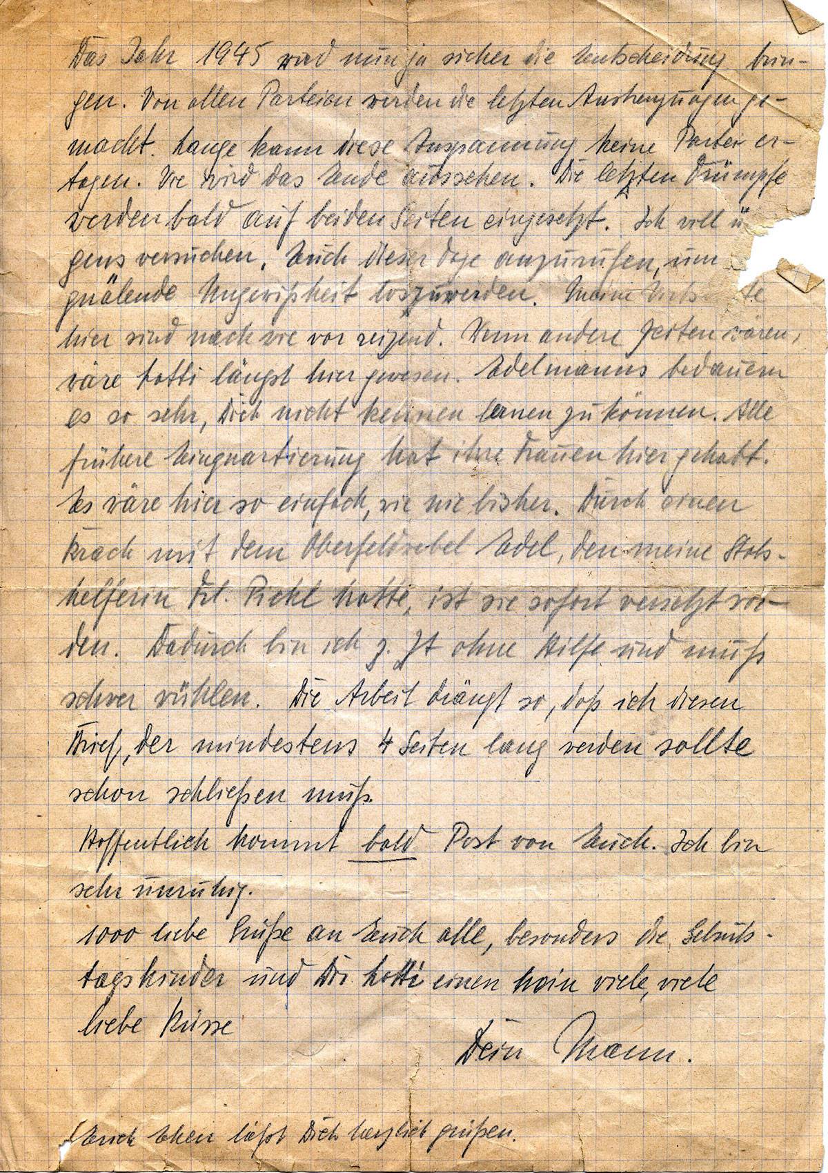 Das Jahr 1945 wird ja nun sicher die Entscheidung bringen. Von allen Parteien werden die letzten Anstrengungen gemacht. Lange kann diese Anspannung keine Partei ertragen. Wie wird das Ende aussehen. Die letzten Trümpfe werden bald auf beiden Seiten eingesetzt. Ich will übrigens versuchen, Euch dieser Tage anzurufen, um die quälende Ungewissheit loszuwerden. Meine Wirtsleute hier sind nach wie vor reizend. Wenn andere Zeiten wären, wäre Lotto längst hier gewesen. Edelmanns bedauern es so sehr, Dich nicht kennen lernen zu können. Eine frühere Einquartierung hat ihre Frauen hier gehabt. Es wäre hier so einfach, wie nie bisher. Durch einen Krach mit dem Oberfeldwebel Edel, den meine Stabshelferin Frl. Pickl hatte, ist sie sofort versetzt worden. Dadurch bin ich z.Zt. ohne Hilfe und muss schwer wühlen. Die Arbeit drängt so, dass ich diesen Brief, der mindestens 4 Seiten lang werden sollte schon schließen muss.