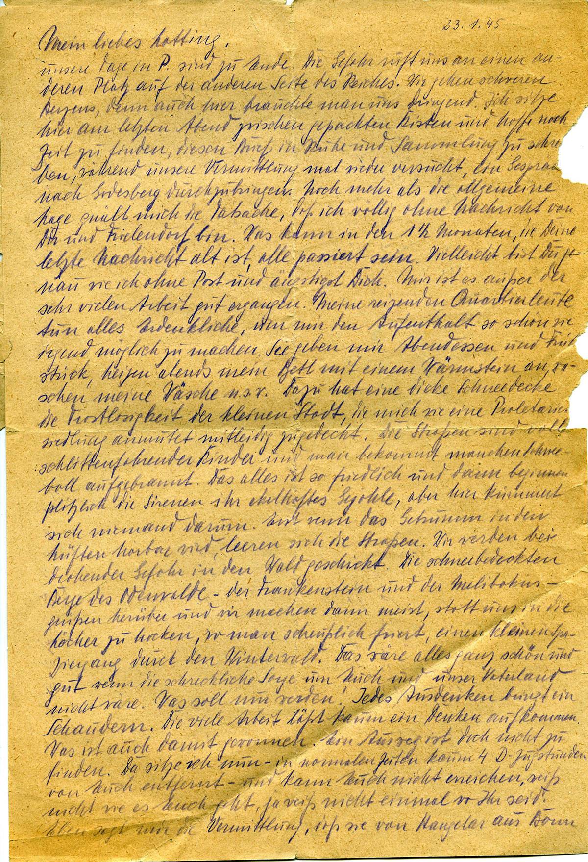 Unsere Tage in P sind zu Ende. Die Gefahr ruft uns an einen anderen Platz auf der anderen Seite des Reiches. Wir gehen schweren Herzens, denn auch hier brauchte man uns dringend. Ich sitze hier am letzten Abend zwischen gepackten Kisten und hoffe noch Zeit zu finden, diesen Brief in Ruhe und Sammlung zu schreiben, während unsere Vermittlung mal wieder versucht, ein Gespräch nach Godesberg durchzubringen. Noch mehr als die allgemeine Lage quält mich die Tatsache, dass ich völlig ohne Nachricht von Dir und Frielendorf bin. Was kann in den 1 ½ Monaten, , die Deine letzte Nachricht alt ist, alle(s) passiert sein. Vielleicht bist Du genau wie ich ohne Post und ängstigt Dich. Mir ist es außer der sehr vielen Arbeit gut ergangen. Meine reizenden Quartier Leute tun alles Erdenkliche, um mir den Aufenthalt so schön wie irgend möglich zu machen. Sie geben mir Abendessen und Frühstück, heizen abends mein Bett mit einem Wärmstein an, waschen meine Wäsche usw. Dazu hat eine dicke Schneedecke die Trostlosigkeit der kleinen Stadt, die mich wie eine Proletariersiedlung anmutet mitleidig zugedeckt. Die Straßen sind voll schlittenfahrender Kinder und man bekommt manchen Schneeball aufgebrannt. Das alles ist so friedlich und dann beginnen plötzlich die Sirenen ihr ekelhaftes Gejohle, aber hier kümmert sich niemand darum. Erst wenn das Gebrumm in den Lüften hörbar wird, leeren sich die Straßen. Wir werden bei drohender Gefahr in den Wald geschickt. Die schneebedeckten Berge des Odenwaldes – der Frankenstein und der Millibogkuss – Grüßen herüber und wir machen dann meist, statt uns in die Löcher zu hocken, wo man scheußlich friert, einen kleinen Spaziergang durch den Winterwald. Es wäre alles ganz schön und gut wenn die schreckliche Sorge um Euch und unser Vaterland nicht wäre. Was soll nun werden! Jedes Ausdenken bringt ein Schaudern. Die viele Arbeit lässt kaum ein Denken aufkommen. Das ist auch damit gewonnen. Ein Ausweg ist doch nicht zu finden. Da sitze ich nun – in normalen Zeiten kaum 4 D- Zugstunden von Euch entfernt – und kann Euch nicht erreichen, weiß nicht wie es Euch geht, ja weiß nicht einmal wo ihr seid. Eben sagt mir die Vermittlung, dass sie von Hangelar aus Bonn