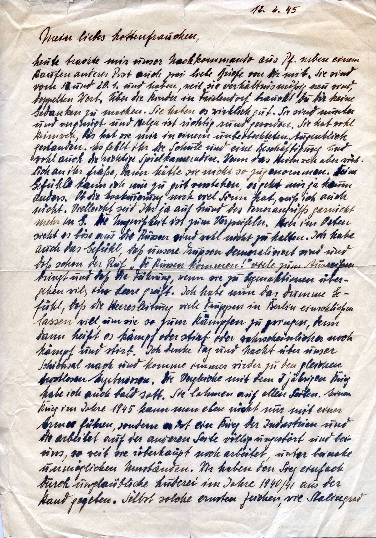 Heute brachte mir unser Nachkommando aus Pf. Neben einem Haufen anderer Post auch zwei liebe Briefe von Dir mit. Sie sind vom 17. (?) und 20. 1. und haben, weil sie verhältnismäßig neu sind, doppelten Wert. Über die Kinder in Frielendorf brauchst Du Dir keine Gedanken zu machen. Sie haben es wirklich gut. Sie sind munter und vergnügt und Helga ist richtig rund geworden. Sie hat wohl Heimweh. Das hat sie mir in einem unbeobachteten Augenblick gestanden. Es fehlt ihr die Schule und eine Beschäftigung und wohl auch die richtige Spielkameradin. Wenn das Heimweh aber wirklich an ihr fräße, dann hätte sie nicht so zugenommen. Deine Gefühle kann ich nur zu gut verstehen, es geht mir ja kaum anders. Ob die Evakuierung noch viel Sinn hat, weiß ich auch nicht. Vielleicht seid Ihr ja aufgrund des Terrorangriffs garnicht mehr in G. Die Ungewissheit ist zum verzweifeln. Hier im Osten sieht es böse aus die Russen sind wohl nicht zu halten. Ich habe auch das Gefühl, dass unsere Truppen demoralisiert sind und dass schon der Ruf „die Russen kommen!“ viele zum Ausreißen bringt und dass die Führung, wenn sie zu Gegenaktionen übergehen will, ins Leere greift. Ich habe nun das dumme Gefühl, dass die Heeresleitung viele Truppen in Berlin einschließen lassen will, um sie so zum Kämpfen zu zwingen, denn dann heißt es kämpf oder stirb oder wahrscheinlicher noch kämpf und stirb. Ich denke Tag und Nacht über unser Schicksal nach und komme immer wieder zu den gleichen trostlosen Ergebnissen. Die Vergleiche mit dem 7jährigen Krieg habe ich auch bald satt. Sie lahmen auf allen Seiten. Einen Krieg im Jahre 1945 kann man eben nicht nur mit einer Armee führen, sondern es ist ein Krieg der Industrien und die arbeitet auf der anderen Seite völlig ungestört und bei uns, soweit sie überhaupt noch arbeitet, unter beinahe unmöglichen Umständen. Wir haben den Sieg einfach durch unglaubliche Luderei im Jahre 1940/41 aus der Hand gegeben. Selbst solche ernsten Zeichen, wie Stalingrad …