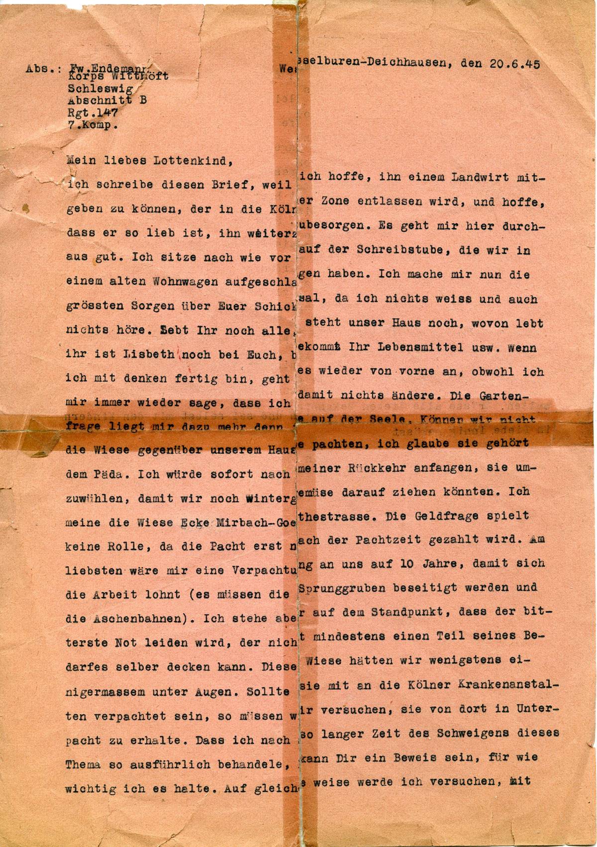 Ich schreibe diesen Brief, weil ich hoffe, ihn einem Landwirt mitgeben zu können, der in die Kölner Zone entlassen wird, und hoffe, dass er so lieb ist, ihn weiter zu besorgen. Es geht mir hier durchaus gut. Ich sitze nach wie vor auf der Schreibstube, die wir in einem alten Wohnwagen aufgeschlagen haben. Ich mache mir nun die größten Sorgen über euer Schicksal, da ich nichts weiß und auch nichts hören. Lebt ihr noch eine, steht unser Haus noch, wovon lebt Ihr, ist Lisbeth noch bei euch, bekommt ihr Lebensmittel usw. Wenn ich mit denken fertig bin, geht es wieder von vorne an, obwohl ich mir immer wieder sage, dass ich damit nichts ändere. Die Gartenfrage liegt mir dazu mehr denn je auf der Seele. Können wir nicht die Wiese gegenüber unserem Hause pachten. Ich glaube sie gehört dem Päda. Ich würde sofort nach meiner Rückkehr anfangen, sie um zu fühlen, damit wir noch Wintergemüse darauf ziehen könnten ich meine die Wiese Ecke Mirbach-Goethestraße. Die Geldfrage spielt keine Rolle, da die Pacht erst nach der Pachtzeit gezahlt wird. Am liebsten wäre mir eine Verpachtung an uns auf 10 Jahre, damit sich die Arbeit lohnt (es müssen die Sprunggruben beseitigt werden und die Aschenbahnen). Ich stehe aber auf dem Standpunkt, dass der bitterste Not leiden wird, der nicht mindestens einen Teil seines Bedarfes selber denken kann. Diese Wiese hätten wir wenigstens einigermaßen unter Augen. Sollte sie mit an die Kölner Krankenanstalten verpachtet sein, so müssen wir versuchen, sie von dort in unter Pacht zu erhalten. Dass ich nach so langer Zeit des Schweigens dieses Thema so ausführlich behandele, kann Dir ein Beweis sein, für ewig wichtig ich es halte. Auf gleiche weise werde ich versuchen, mit