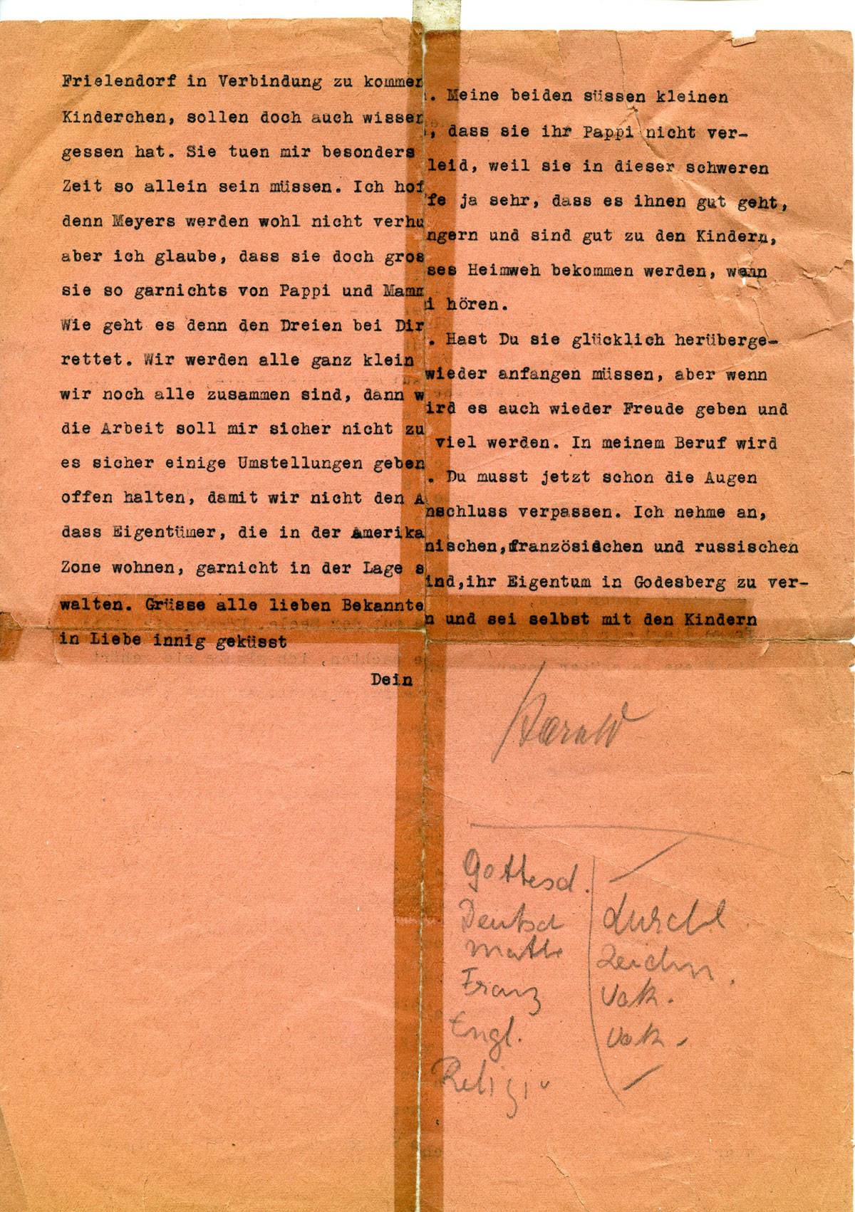 Wie geht es denn den Dreien bei Dir. Hast Du sie glücklich herüber gerettet. Wir werden alle ganz klein wieder anfangen müssen, aber wenn wir noch alle zusammen sind, dann wird es auch wieder Freude geben und die Arbeit sei mir sicher nicht zu viel werden. In meinem Beruf wird es sicher einige Umstellungen geben. Du musst jetzt schon die Augen offen halten, damit wir nicht den Anschluss verpassen. Ich nehme an, dass Eigentümer, die in der Amerikanischen, französischen und russischen Zone wohnen, garnicht in der Lage sind, ihr Eigentum in Godesberg zu verwalten. Grüße alle lieben Bekannten und sei selbst mit den Kindern in Liebe innig geküsst