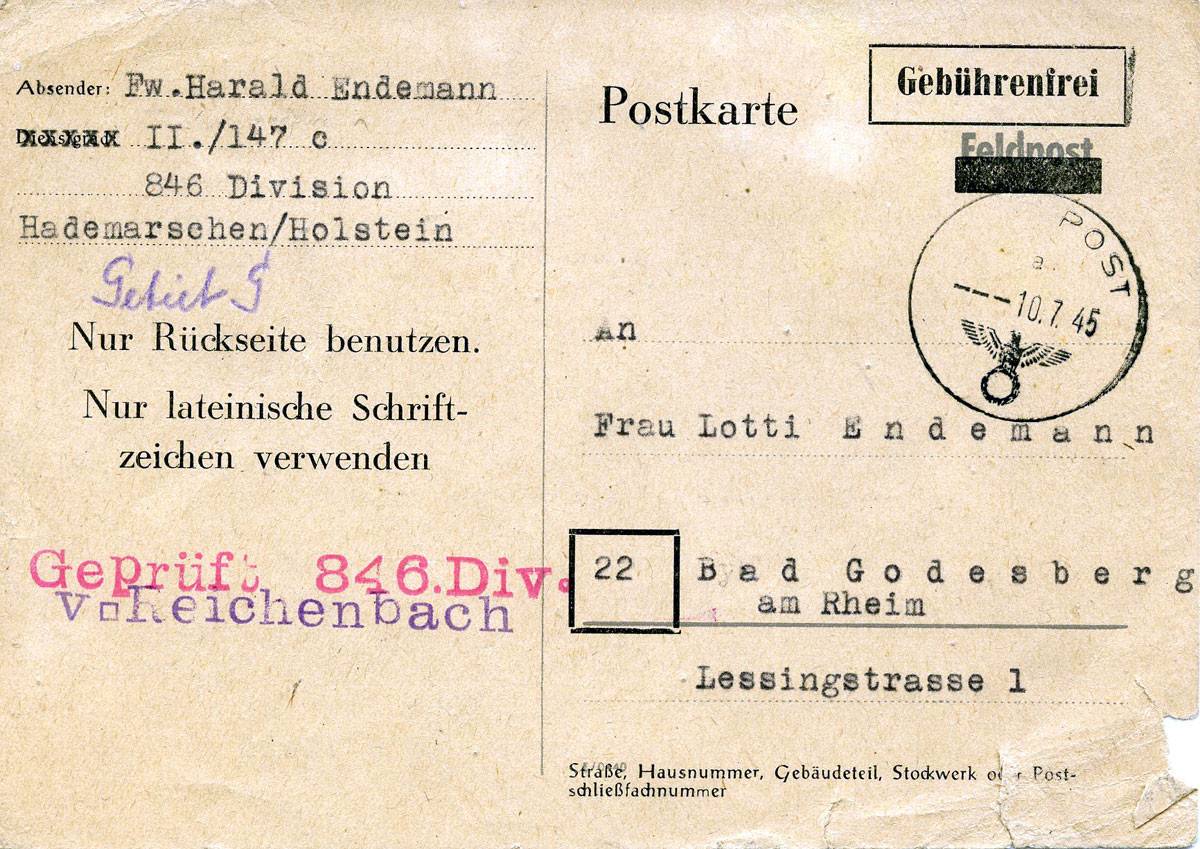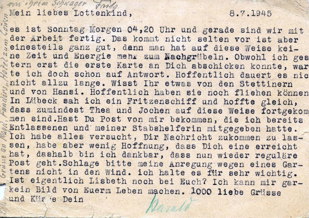 Harald Endemann an seine Frau Charlotte, 8. Juli 1945