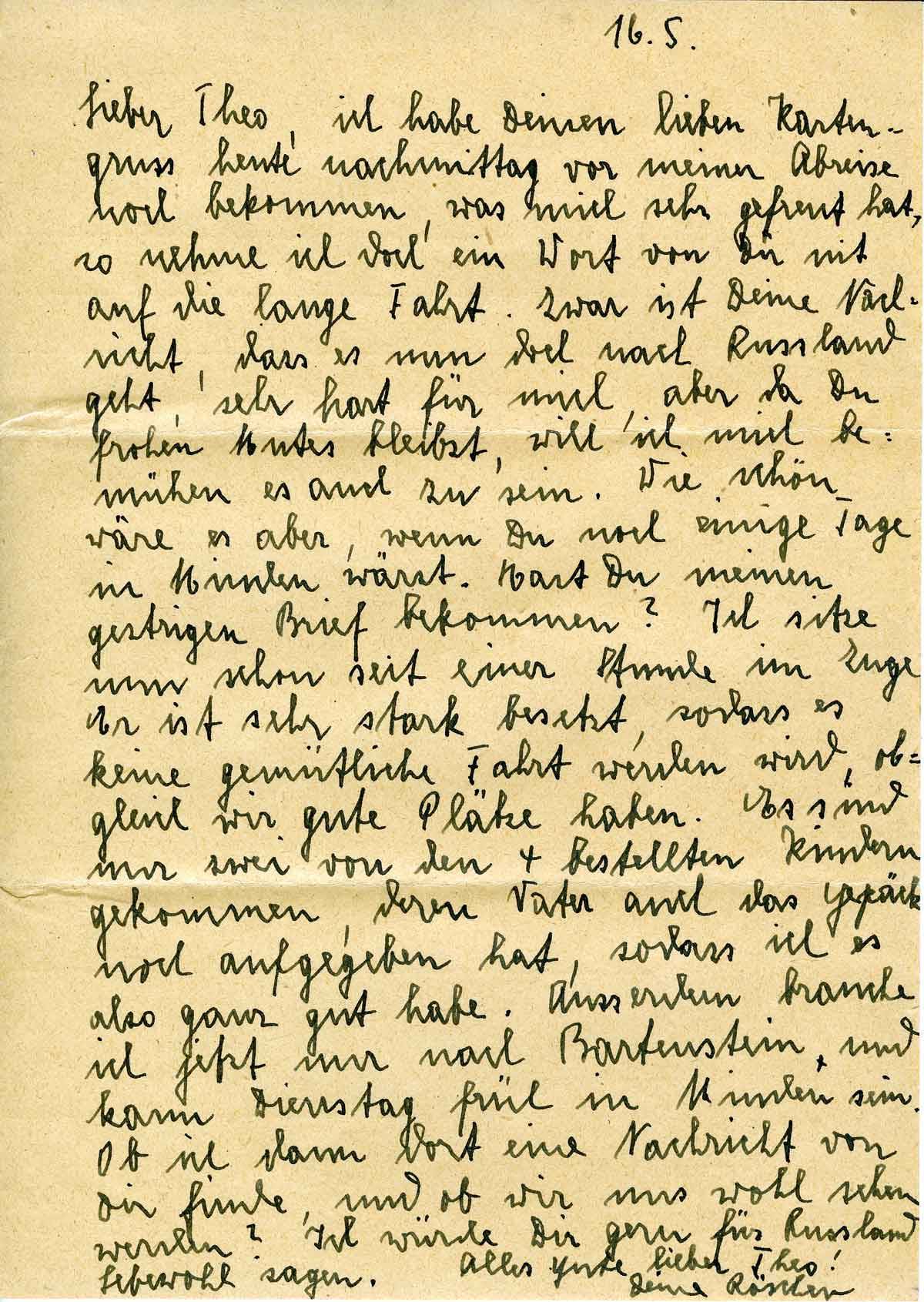 ich habe Deine lieben Kartengruß heute Nachmittag vor meiner Abreise noch bekommen, was mich sehr gefreut hat, so nehme ich doch ein Wort von Dir mit auf die lange Fahrt. Zwar ist Deine Nachricht , dass es nun doch nach Russland geht, sehr hart für mich, aber da Du frohen Mutes bleibst, will ich mich bemühen es auch zu sein. Wie schön wäre es aber, wenn Du noch einige Tage in Minden wärst. Hast Du meinen gestrigen Brief bekommen? Ich sitze nun schon seit einer Stunde im Zuge. Er ist sehr stark besetzt, sodass es keine gemütliche Fahrt werden wird, obgleich wir gute Plätze haben. Es sind nur zwei von den vier bestellten Kindern gekommen, deren Vater auch das Gepäck noch aufgegeben hat, sodass ich es also ganz gut habe. Außerdem brauche ich jetzt nur nach Bartenstein und kann Dienstag früh in Minden sein. Ob ich dann dort eine Nachricht von Dir finde, und ob wir uns wohl sehen werden?