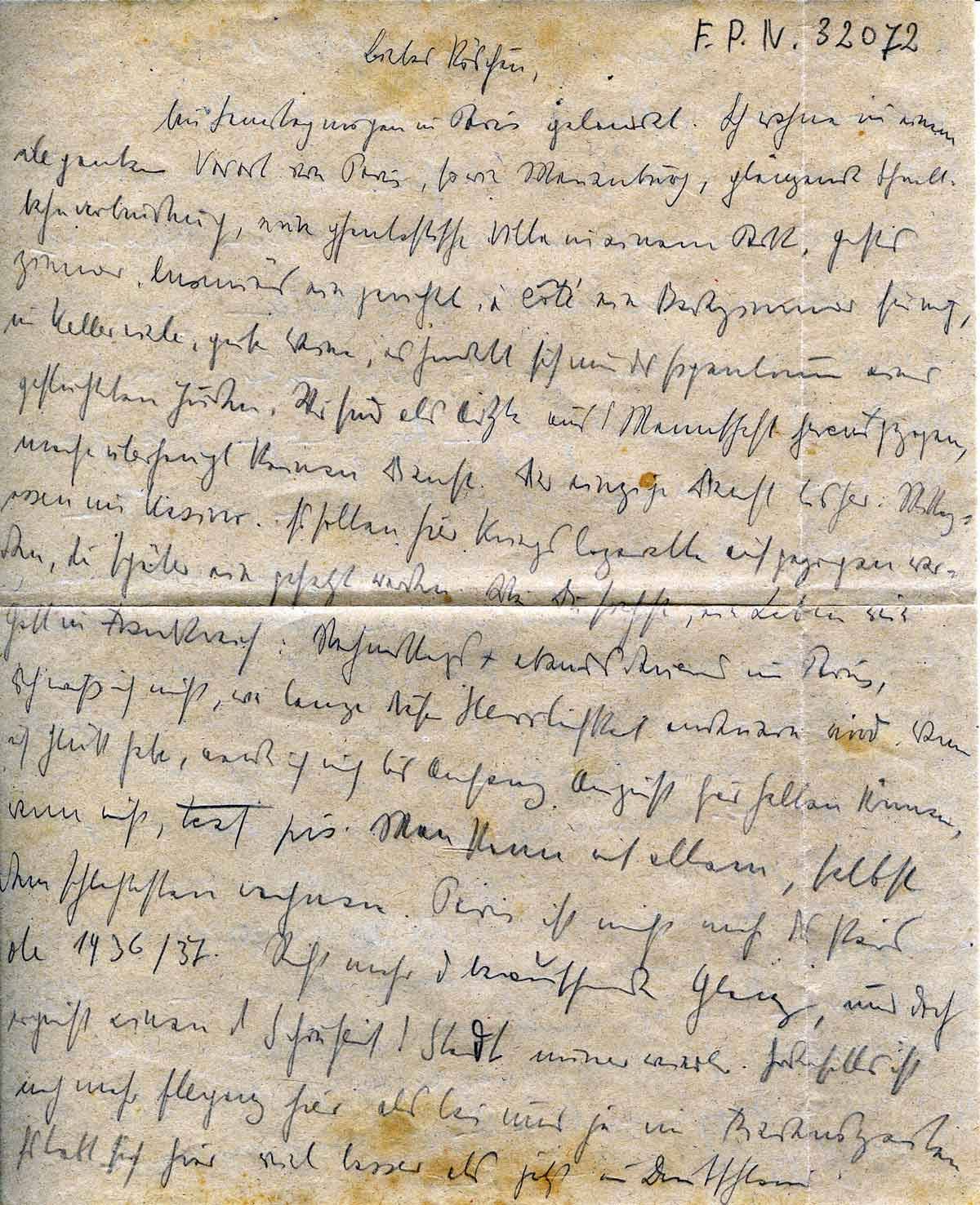 bin Samstagmorgen in Paris gelandet. Ich wohne in einem eleganten Vorort von Paris, so wie Marienburg , glänzende Schnellbahnverbindung, eine fantastische Villa in einem Park, großes Zimmer, luxuriös eingerichtet, ein Badezimmer für mich, im Keller viel gute Weine, es handelt sich um das [...] eines geflüchteten Juden. Wir sind als Ärzte aus der Mannschaft herausgezogen, machen überhaupt keinen Dienst. Der einzige Dienst hier: Mittagessen im Kasino. Es sollen hier Kriegslazarette aufgestellt werden, die später eingesetzt werden. Wie Du siehst, wir leben wie Gott in Frankreich: nachmittags und abends in Paris.