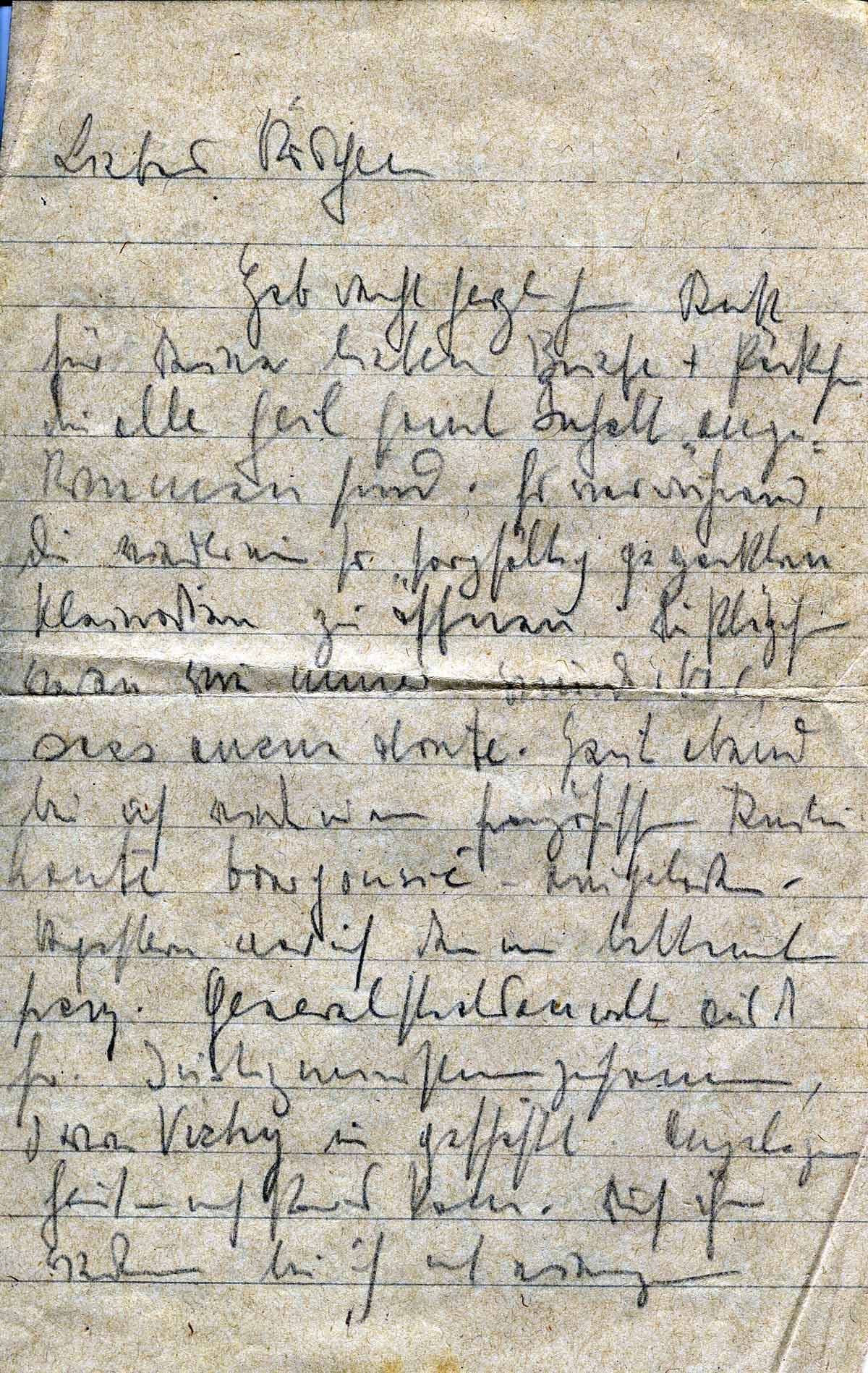 habe recht herzlichen Dank für Deine lieben Briefe und Päckchen, die alle heil samt Inhalt angekommen sind. Es war rührend, die wieder so sorgfältig gepackten Kleinodien zu öffnen. Die Plätzchen waren wie immer wunderbar. Heute Abend bin ich wieder von französischen [...] eingeladen . Vorgestern war ich mit einem franz. Generalssaatsanwalt aus dem Justizministerium zusammen, der aus Vichy in geschäftlichen Angelegenheiten nach Paris kam. Durch ihn wiederum bin ich mit einigen